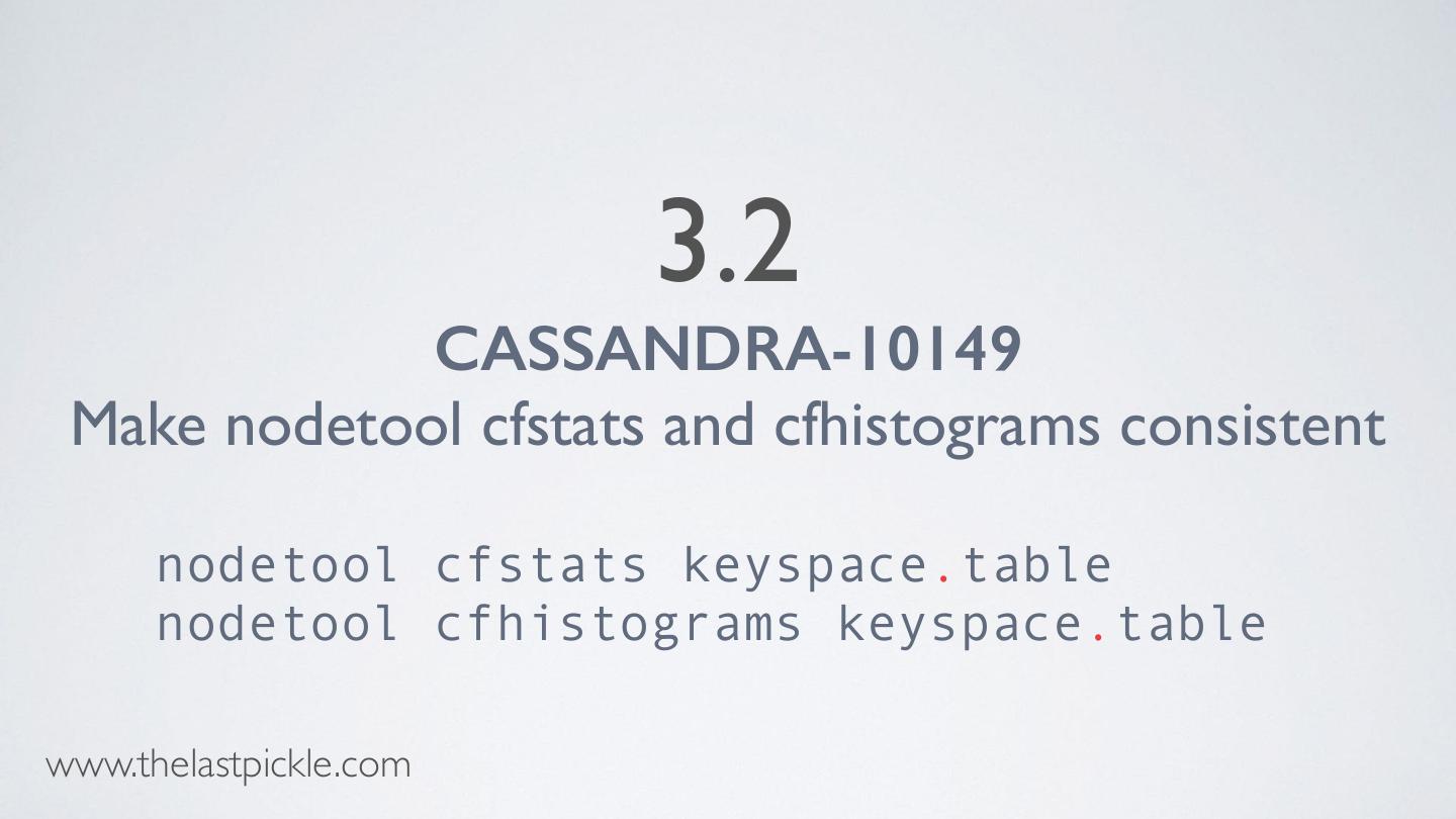 18 . 3.2 CASSANDRA-10149 Make nodetool cfstats and cfhistograms consistent nodetool cfstats keyspace.table nodetool cfhistograms keyspace.table www.thelastpickle.com