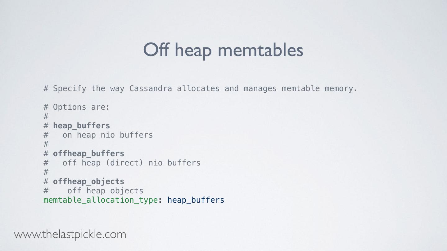 25 . Off heap memtables # Specify the way Cassandra allocates and manages memtable memory. # Options are: # # heap_buffers # on heap nio buffers # # offheap_buffers # off heap (direct) nio buffers # # offheap_objects # off heap objects memtable_allocation_type: heap_buffers www.thelastpickle.com