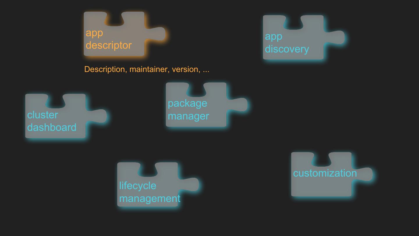 5 . app app descriptor discovery Description, maintainer, version, ... package cluster manager dashboard customization lifecycle management
