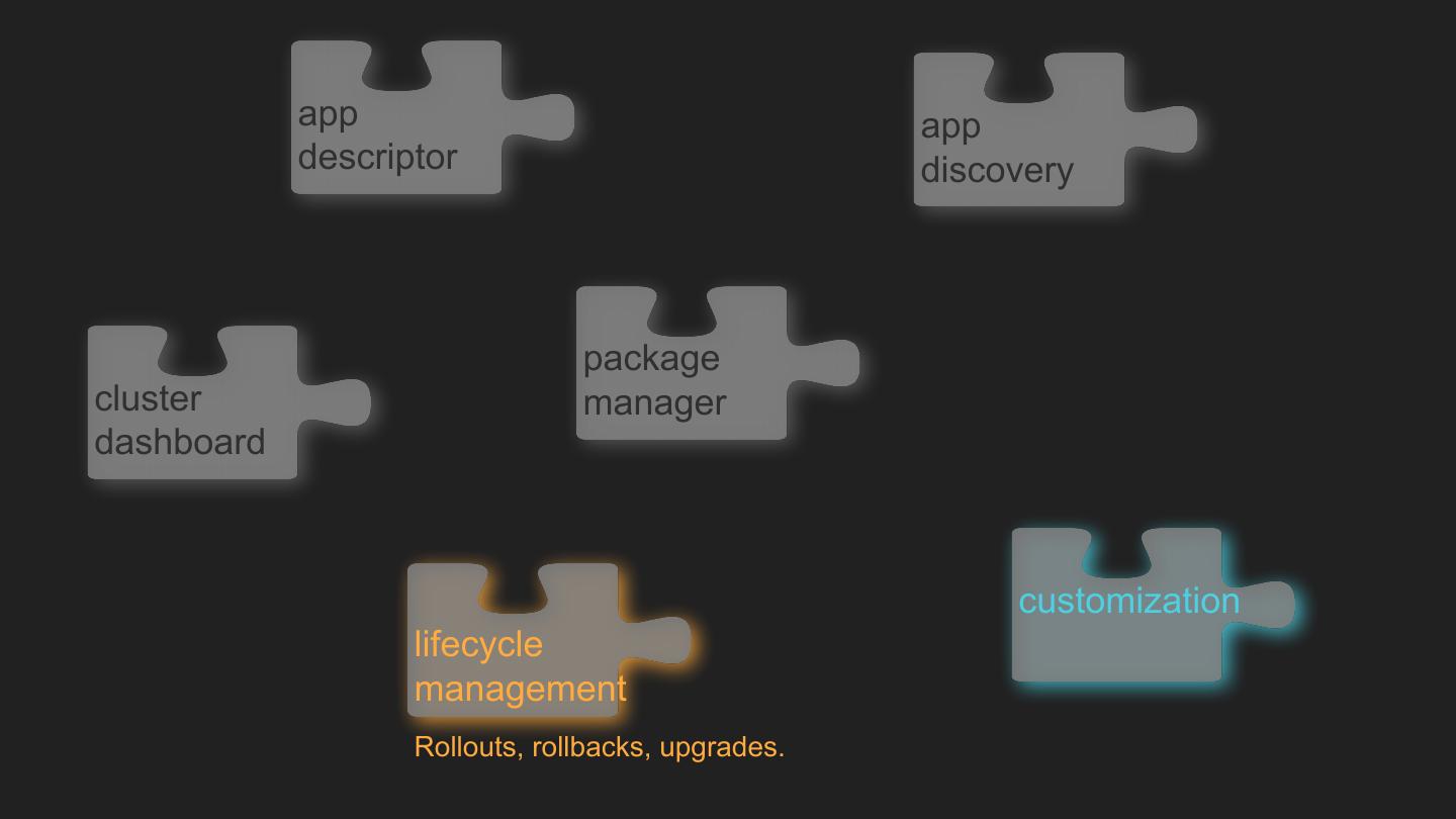 9 . app app descriptor discovery package cluster manager dashboard customization lifecycle management Rollouts, rollbacks, upgrades.