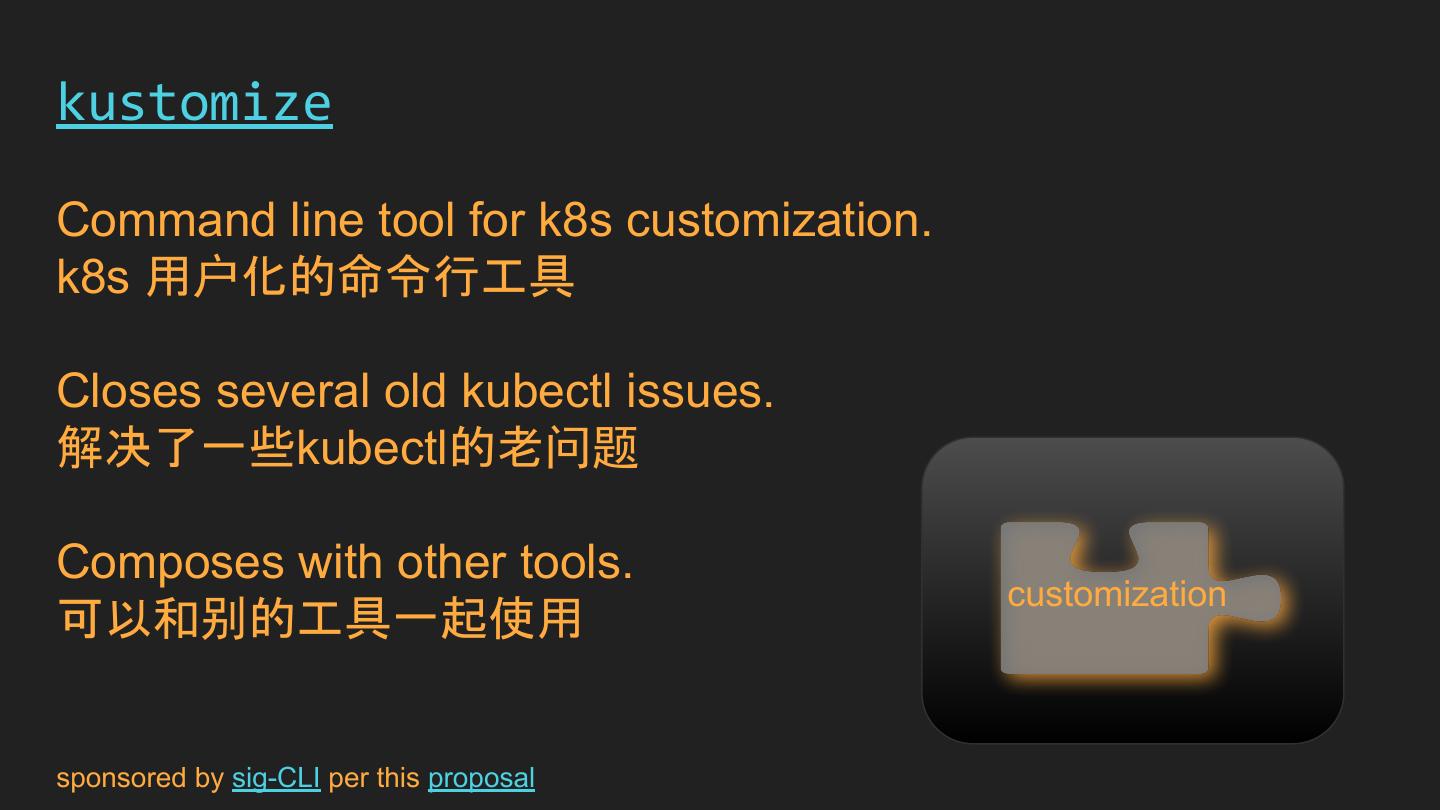 11 .kustomize Command line tool for k8s customization. k8s 用户化的命令行工具 Closes several old kubectl issues. 解决了一些kubectl的老问题 Composes with other tools. customization 可以和别的工具一起使用 sponsored by sig-CLI per this proposal