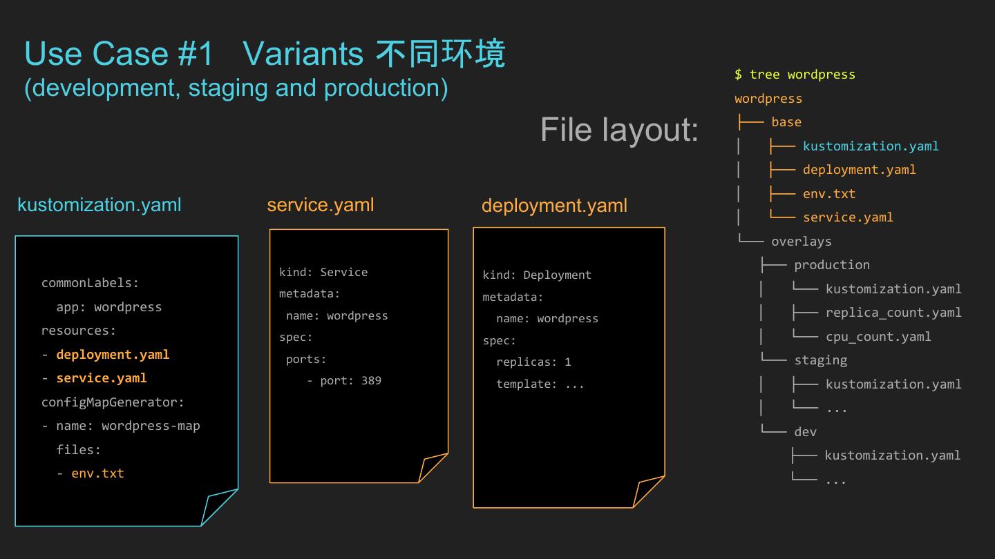 23 .Use Case #1 Variants 不同环境 $ tree wordpress (development, staging and production) wordpress ├── base │ ├── kustomization.yaml │ ├── deployment.yaml │ ├── env.txt kustomization.yaml replica_count.yaml cpu_count.yaml │ └── service.yaml └── overlays namePrefix: prod- kind: Deployment kind: Deployment ├── production commonLabels: metadata: metadata: │ ├── kustomization.yaml variant: prod name: wordpress name: wordpress │ ├── replica_count.yaml commonAnnotations: spec: spec: │ └── cpu_count.yaml note: I’m Prod! replicas: 80 template: └── staging bases: spec: │ ├── kustomization.yaml - ../../base containers: │ └── ... patchesStrategicMerge: - name: my-container └── dev - replica_count.yaml resources: ├── kustomization.yaml - cpu_count.yaml limits: └── ... cpu: 7000m