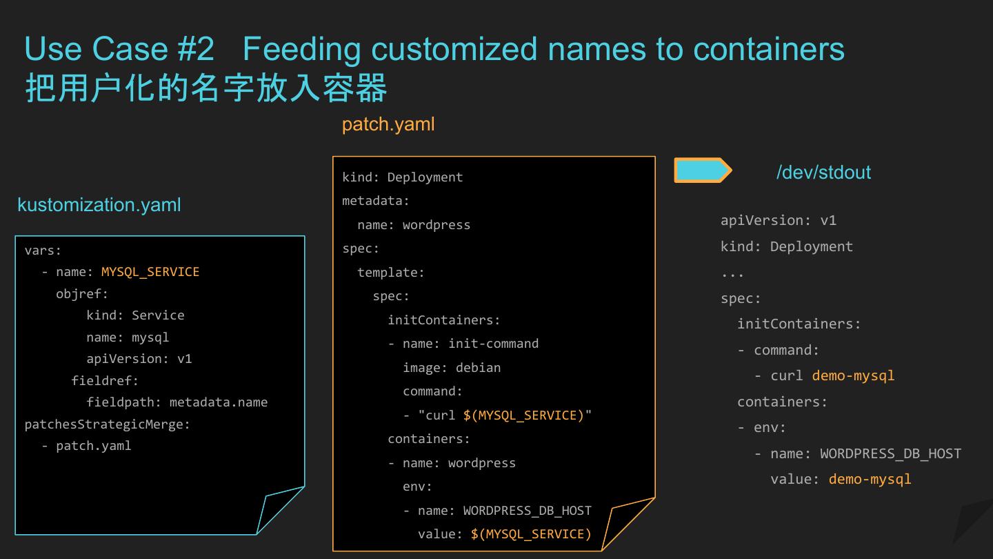 27 .Use Case #2 Feeding customized names to containers 把用户化的名字放入容器 patch.yaml kind: Deployment /dev/stdout kustomization.yaml metadata: name: wordpress apiVersion: v1 vars: spec: kind: Deployment - name: MYSQL_SERVICE template: ... objref: spec: spec: kind: Service initContainers: initContainers: name: mysql - name: init-command - command: apiVersion: v1 image: debian fieldref: - curl demo-mysql command: fieldpath: metadata.name containers: - "curl $(MYSQL_SERVICE)" patchesStrategicMerge: - env: - patch.yaml containers: - name: WORDPRESS_DB_HOST - name: wordpress env: value: demo-mysql - name: WORDPRESS_DB_HOST value: $(MYSQL_SERVICE)