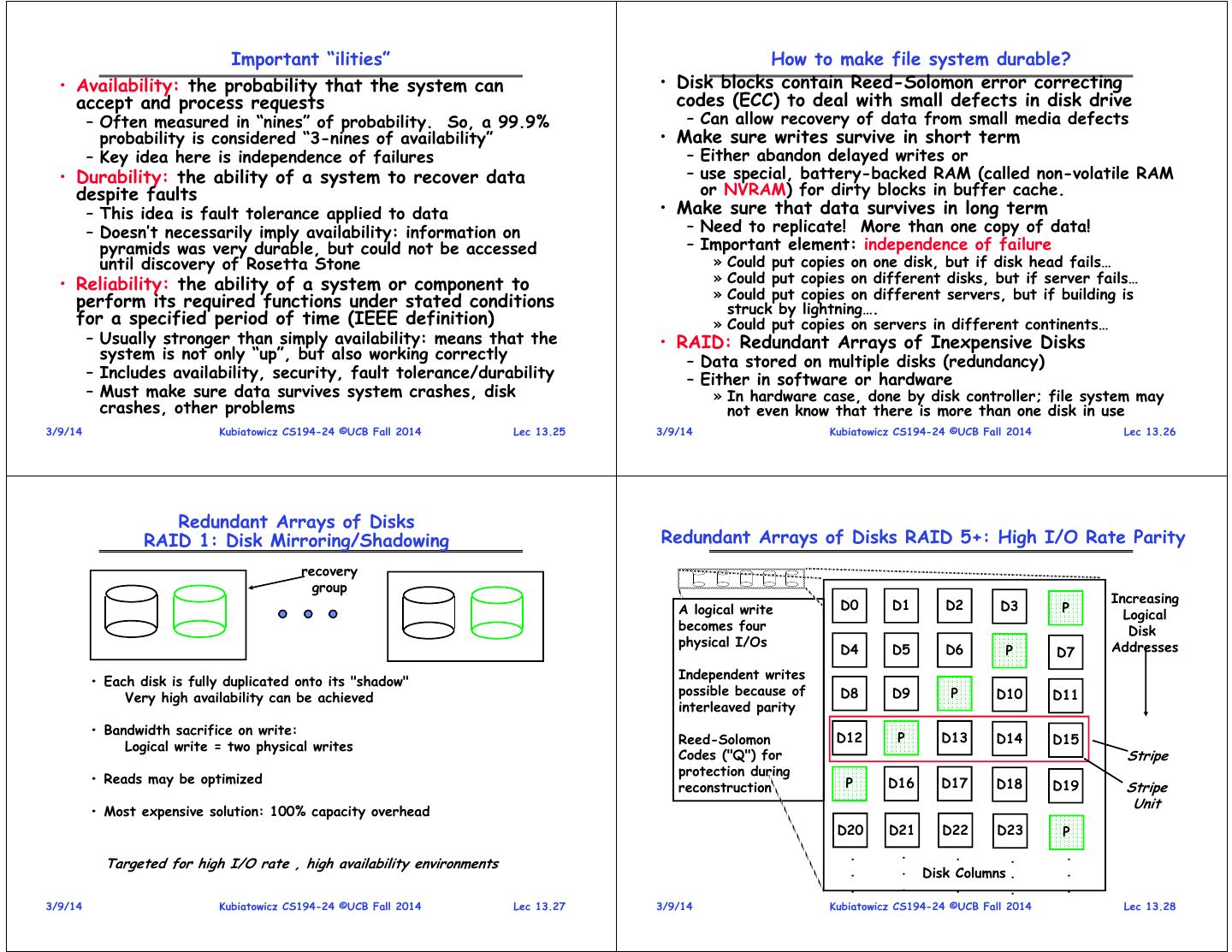 7 . Important “ilities” How to make file system durable? • Availability: the probability that the system can • Disk blocks contain Reed-Solomon error correcting accept and process requests codes (ECC) to deal with small defects in disk drive – Often measured in “nines” of probability. So, a 99.9% – Can allow recovery of data from small media defects probability is considered “3-nines of availability” • Make sure writes survive in short term – Key idea here is independence of failures – Either abandon delayed writes or • Durability: the ability of a system to recover data – use special, battery-backed RAM (called non-volatile RAM despite faults or NVRAM) for dirty blocks in buffer cache. – This idea is fault tolerance applied to data • Make sure that data survives in long term – Doesn’t necessarily imply availability: information on – Need to replicate! More than one copy of data! pyramids was very durable, but could not be accessed – Important element: independence of failure until discovery of Rosetta Stone » Could put copies on one disk, but if disk head fails… • Reliability: the ability of a system or component to » Could put copies on different disks, but if server fails… » Could put copies on different servers, but if building is perform its required functions under stated conditions struck by lightning…. for a specified period of time (IEEE definition) » Could put copies on servers in different continents… – Usually stronger than simply availability: means that the • RAID: Redundant Arrays of Inexpensive Disks system is not only “up”, but also working correctly – Data stored on multiple disks (redundancy) – Includes availability, security, fault tolerance/durability – Either in software or hardware – Must make sure data survives system crashes, disk » In hardware case, done by disk controller; file system may crashes, other problems not even know that there is more than one disk in use 3/9/14 Kubiatowicz CS194-24 ©UCB Fall 2014 Lec 13.25 3/9/14 Kubiatowicz CS194-24 ©UCB Fall 2014 Lec 13.26 Redundant Arrays of Disks RAID 1: Disk Mirroring/Shadowing Redundant Arrays of Disks RAID 5+: High I/O Rate Parity recovery group Increasing A logical write D0 D1 D2 D3 P Logical becomes four Disk physical I/Os Addresses D4 D5 D6 P D7 Independent writes • Each disk is fully duplicated onto its "shadow" possible because of D8 D9 P D10 D11 Very high availability can be achieved interleaved parity • Bandwidth sacrifice on write: Reed-Solomon D12 P D13 D14 D15 Logical write = two physical writes Codes ("Q") for Stripe protection during • Reads may be optimized P D16 D17 D18 D19 reconstruction Stripe Unit • Most expensive solution: 100% capacity overhead D20 D21 D22 D23 P . . . . . Targeted for high I/O rate , high availability environments . . Disk .Columns . . . . . . . 3/9/14 Kubiatowicz CS194-24 ©UCB Fall 2014 Lec 13.27 3/9/14 Kubiatowicz CS194-24 ©UCB Fall 2014 Lec 13.28