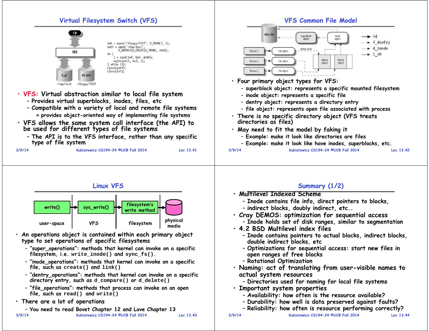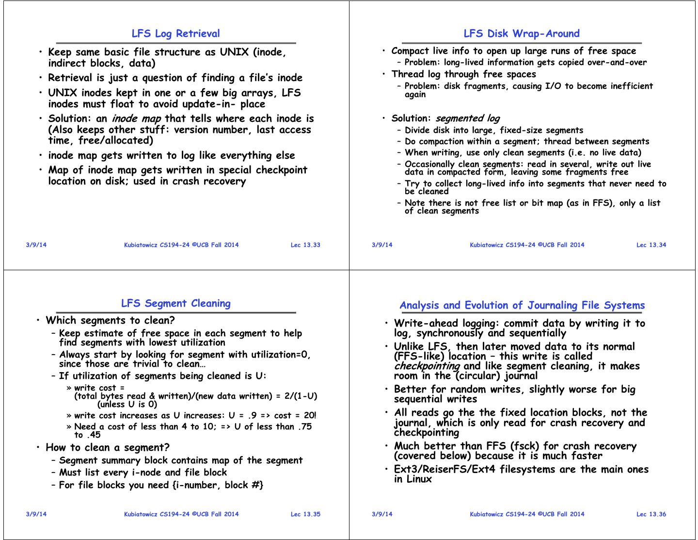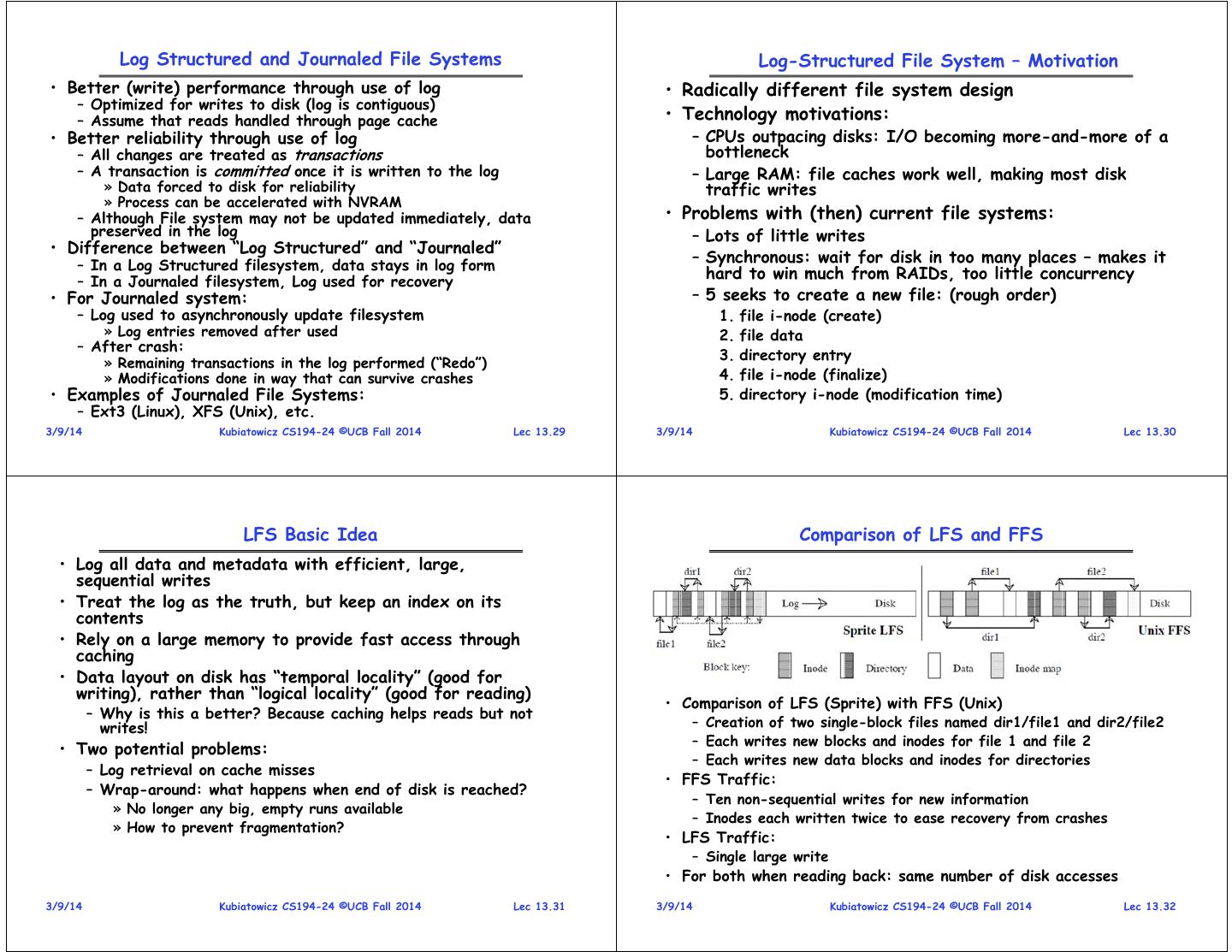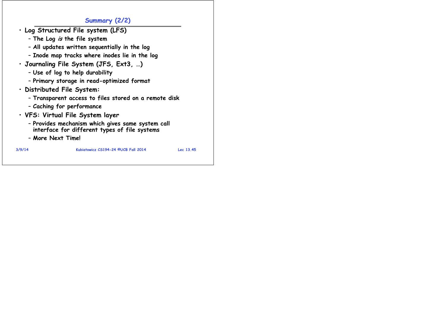12 . Summary (2/2) • Log Structured File system (LFS) – The Log is the file system – All updates written sequentially in the log – Inode map tracks where inodes lie in the log • Journaling File System (JFS, Ext3, …) – Use of log to help durability – Primary storage in read-optimized format • Distributed File System: – Transparent access to files stored on a remote disk – Caching for performance • VFS: Virtual File System layer – Provides mechanism which gives same system call interface for different types of file systems – More Next Time! 3/9/14 Kubiatowicz CS194-24 ©UCB Fall 2014 Lec 13.45