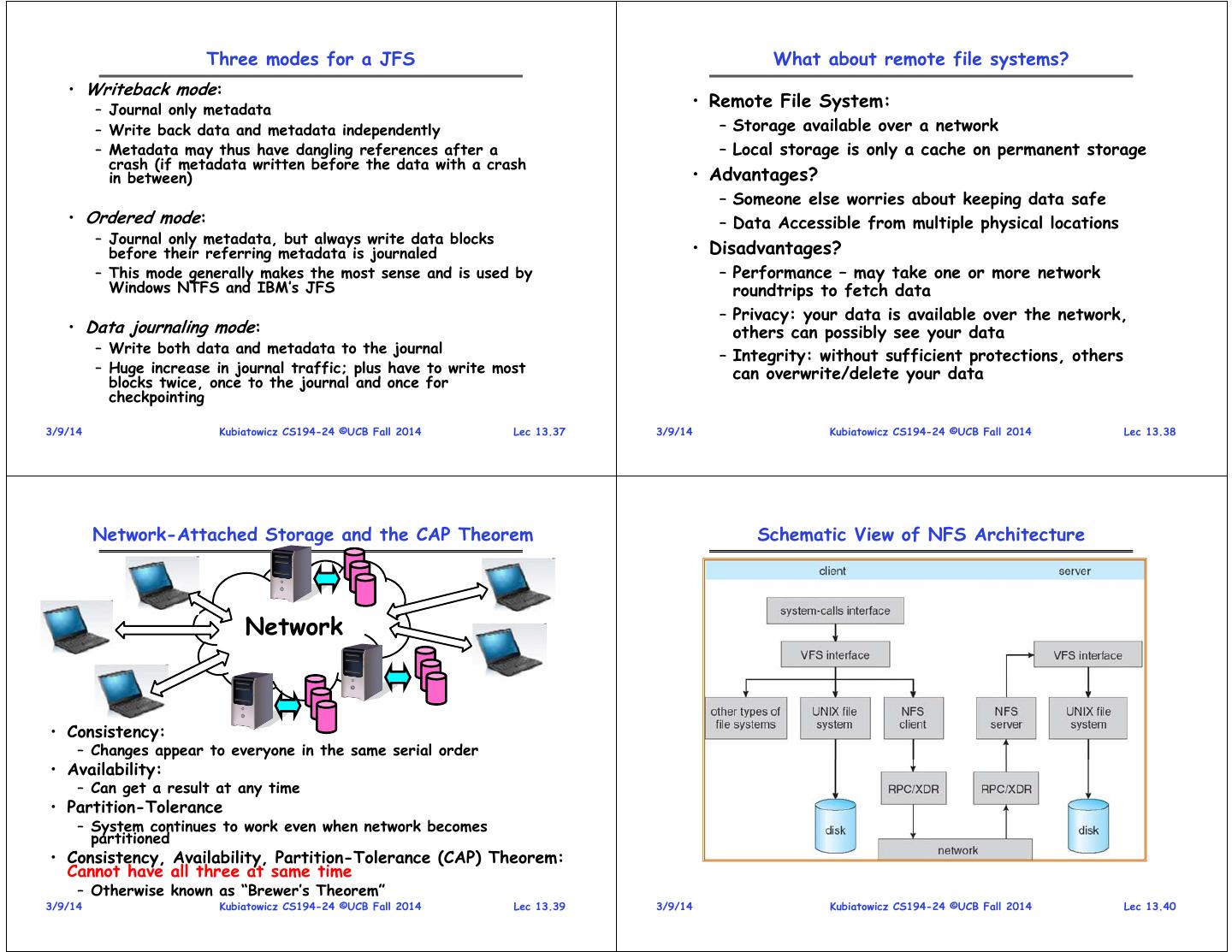 10 . Three modes for a JFS What about remote file systems? • Writeback mode: – Journal only metadata • Remote File System: – Write back data and metadata independently – Storage available over a network – Metadata may thus have dangling references after a – Local storage is only a cache on permanent storage crash (if metadata written before the data with a crash in between) • Advantages? – Someone else worries about keeping data safe • Ordered mode: – Data Accessible from multiple physical locations – Journal only metadata, but always write data blocks before their referring metadata is journaled • Disadvantages? – This mode generally makes the most sense and is used by – Performance – may take one or more network Windows NTFS and IBM’s JFS roundtrips to fetch data – Privacy: your data is available over the network, • Data journaling mode: others can possibly see your data – Write both data and metadata to the journal – Integrity: without sufficient protections, others – Huge increase in journal traffic; plus have to write most can overwrite/delete your data blocks twice, once to the journal and once for checkpointing 3/9/14 Kubiatowicz CS194-24 ©UCB Fall 2014 Lec 13.37 3/9/14 Kubiatowicz CS194-24 ©UCB Fall 2014 Lec 13.38 Network-Attached Storage and the CAP Theorem Schematic View of NFS Architecture Network • Consistency: – Changes appear to everyone in the same serial order • Availability: – Can get a result at any time • Partition-Tolerance – System continues to work even when network becomes partitioned • Consistency, Availability, Partition-Tolerance (CAP) Theorem: Cannot have all three at same time – Otherwise known as “Brewer’s Theorem” 3/9/14 Kubiatowicz CS194-24 ©UCB Fall 2014 Lec 13.39 3/9/14 Kubiatowicz CS194-24 ©UCB Fall 2014 Lec 13.40