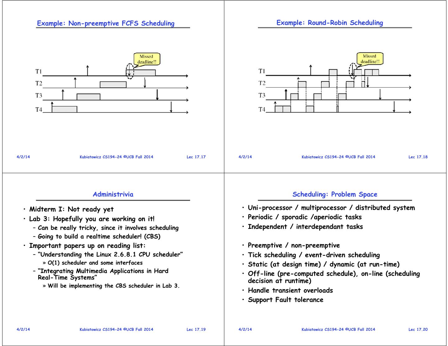5 . Example: Non-preemptive FCFS Scheduling Example: Round-Robin Scheduling 4/2/14 Kubiatowicz CS194-24 ©UCB Fall 2014 Lec 17.17 4/2/14 Kubiatowicz CS194-24 ©UCB Fall 2014 Lec 17.18 Administrivia Scheduling: Problem Space • Midterm I: Not ready yet • Uni-processor / multiprocessor / distributed system • Lab 3: Hopefully you are working on it! • Periodic / sporadic /aperiodic tasks – Can be really tricky, since it involves scheduling • Independent / interdependant tasks – Going to build a realtime scheduler! (CBS) • Important papers up on reading list: • Preemptive / non-preemptive – “Understanding the Linux 2.6.8.1 CPU scheduler” • Tick scheduling / event-driven scheduling » O(1) scheduler and some interfaces • Static (at design time) / dynamic (at run-time) – “Integrating Multimedia Applications in Hard • Off-line (pre-computed schedule), on-line (scheduling Real-Time Systems” decision at runtime) » Will be implementing the CBS scheduler in Lab 3. • Handle transient overloads • Support Fault tolerance 4/2/14 Kubiatowicz CS194-24 ©UCB Fall 2014 Lec 17.19 4/2/14 Kubiatowicz CS194-24 ©UCB Fall 2014 Lec 17.20