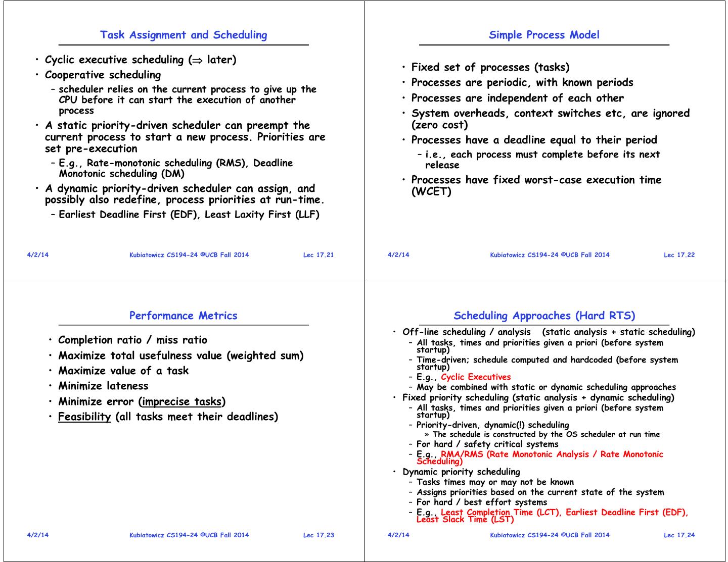 6 . Task Assignment and Scheduling Simple Process Model • Cyclic executive scheduling ( later) • Fixed set of processes (tasks) • Cooperative scheduling • Processes are periodic, with known periods – scheduler relies on the current process to give up the CPU before it can start the execution of another • Processes are independent of each other process • System overheads, context switches etc, are ignored • A static priority-driven scheduler can preempt the (zero cost) current process to start a new process. Priorities are • Processes have a deadline equal to their period set pre-execution – i.e., each process must complete before its next – E.g., Rate-monotonic scheduling (RMS), Deadline release Monotonic scheduling (DM) • Processes have fixed worst-case execution time • A dynamic priority-driven scheduler can assign, and (WCET) possibly also redefine, process priorities at run-time. – Earliest Deadline First (EDF), Least Laxity First (LLF) 4/2/14 Kubiatowicz CS194-24 ©UCB Fall 2014 Lec 17.21 4/2/14 Kubiatowicz CS194-24 ©UCB Fall 2014 Lec 17.22 Performance Metrics Scheduling Approaches (Hard RTS) • Off-line scheduling / analysis (static analysis + static scheduling) • Completion ratio / miss ratio – All tasks, times and priorities given a priori (before system startup) • Maximize total usefulness value (weighted sum) – Time-driven; schedule computed and hardcoded (before system startup) • Maximize value of a task – E.g., Cyclic Executives • Minimize lateness – May be combined with static or dynamic scheduling approaches • Fixed priority scheduling (static analysis + dynamic scheduling) • Minimize error (imprecise tasks) – All tasks, times and priorities given a priori (before system • Feasibility (all tasks meet their deadlines) startup) – Priority-driven, dynamic(!) scheduling » The schedule is constructed by the OS scheduler at run time – For hard / safety critical systems – E.g., RMA/RMS (Rate Monotonic Analysis / Rate Monotonic Scheduling) • Dynamic priority scheduling – Tasks times may or may not be known – Assigns priorities based on the current state of the system – For hard / best effort systems – E.g., Least Completion Time (LCT), Earliest Deadline First (EDF), Least Slack Time (LST) 4/2/14 Kubiatowicz CS194-24 ©UCB Fall 2014 Lec 17.23 4/2/14 Kubiatowicz CS194-24 ©UCB Fall 2014 Lec 17.24
