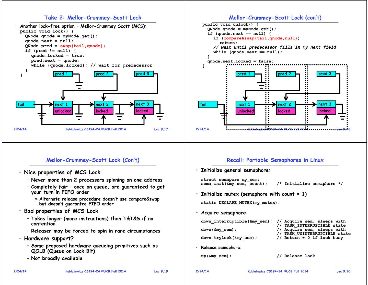 5 . Take 2: Mellor-Crummey-Scott Lock Mellor-Crummey-Scott Lock (con’t) • Another lock-free option – Mellor-Crummey Scott (MCS): public void unlock() { QNode qnode = myNode.get(); public void lock() { if (qnode.next == null) { QNode qnode = myNode.get(); if (compare&swap(tail,qnode,null)) qnode.next = null; return; QNode pred = swap(tail,qnode); // wait until predecessor fills in my next field if (pred != null) { while (qnode.next == null); qnode.locked = true; } pred.next = qnode; qnode.next.locked = false; while (qnode.locked); // wait for predecessor } } } pred 1 pred 2 pred 3 pred 1 pred 2 pred 3 tail next 1 next 2 next 3 tail next 1 next 2 next 3 unlocked unlocked locked unlocked locked unlocked unlocked locked unlocked locked 2/24/14 Kubiatowicz CS194-24 ©UCB Fall 2014 Lec 9.17 2/24/14 Kubiatowicz CS194-24 ©UCB Fall 2014 Lec 9.18 Mellor-Crummey-Scott Lock (Con’t) Recall: Portable Semaphores in Linux • Nice properties of MCS Lock • Initialize general semaphore: – Never more than 2 processors spinning on one address struct semapore my_sem; sema_init(&my_sem, count); /* Initialize semaphore */ – Completely fair – once on queue, are guaranteed to get your turn in FIFO order • Initialize mutex (semaphore with count = 1) » Alternate release procedure doesn’t use compare&swap but doesn’t guarantee FIFO order static DECLARE_MUTEX(my_mutex); • Bad properties of MCS Lock • Acquire semaphore: – Takes longer (more instructions) than T&T&S if no down_interruptible(&my_sem); // Acquire sem, sleeps with contention // TASK_INTERRUPTIBLE state – Releaser may be forced to spin in rare circumstances down(&my_sem); // // Acquire sem, sleeps with TASK_UNINTERRUPTIBLE state • Hardware support? down_trylock(&my_sem); // Return ≠ 0 if lock busy – Some proposed hardware queueing primitives such as • Release semaphore: QOLB (Queue on Lock Bit) up(&my_sem); // Release lock – Not broadly available 2/24/14 Kubiatowicz CS194-24 ©UCB Fall 2014 Lec 9.19 2/24/14 Kubiatowicz CS194-24 ©UCB Fall 2014 Lec 9.20