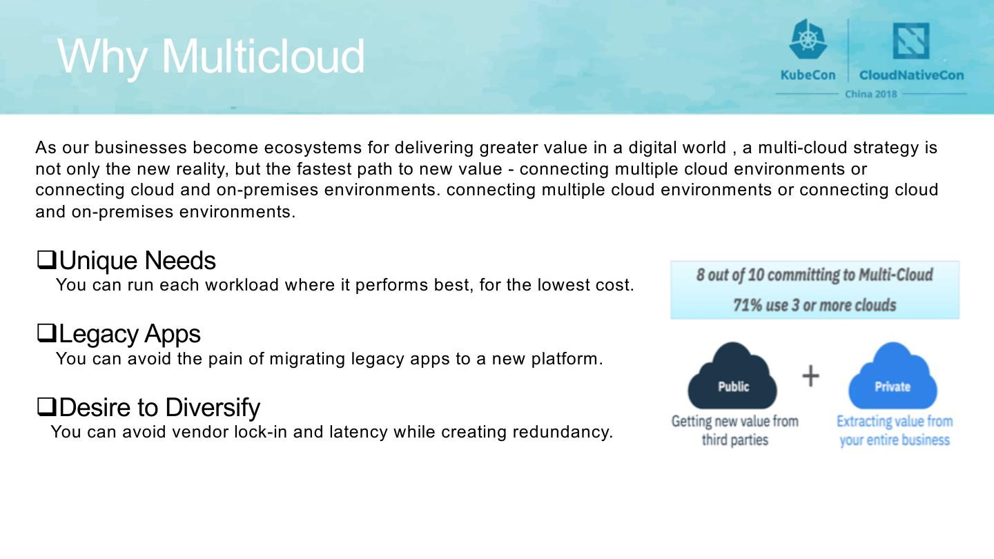 2 . Why Multicloud As our businesses become ecosystems for delivering greater value in a digital world , a multi-cloud strategy is not only the new reality, but the fastest path to new value - connecting multiple cloud environments or connecting cloud and on-premises environments. connecting multiple cloud environments or connecting cloud and on-premises environments. qUnique Needs You can run each workload where it performs best, for the lowest cost. qLegacy Apps You can avoid the pain of migrating legacy apps to a new platform. qDesire to Diversify You can avoid vendor lock-in and latency while creating redundancy.
