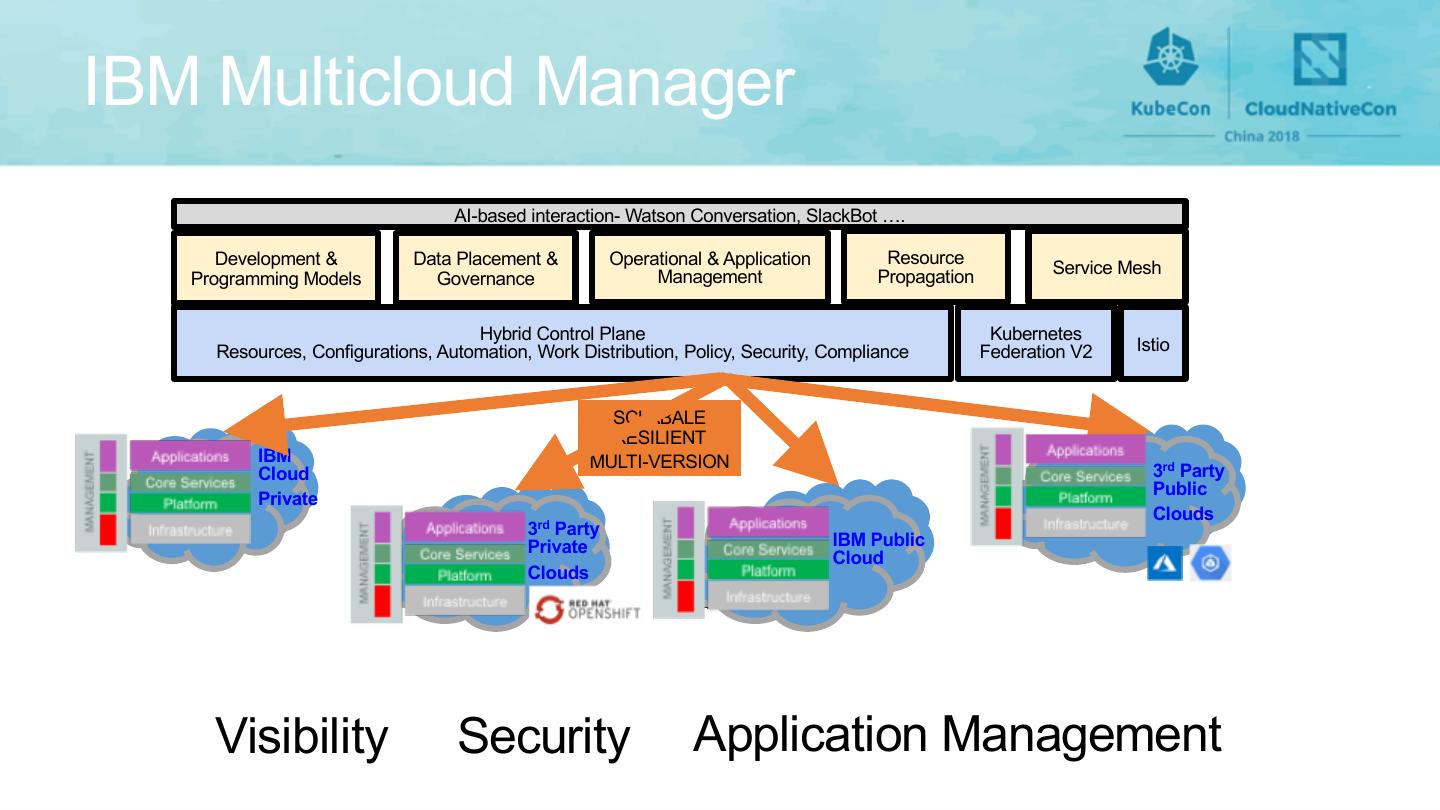 3 .IBM Multicloud Manager AI-based interaction- Watson Conversation, SlackBot …. Development & Data Placement & Operational & Application Resource Management Propagation Service Mesh Programming Models Governance Hybrid Control Plane Kubernetes Resources, Configurations, Automation, Work Distribution, Policy, Security, Compliance Federation V2 Istio SCLABALE RESILIENT IBM MULTI-VERSION Cloud 3rd Party Public Private Clouds 3rd Party Private IBM Public Cloud Clouds Visibility Security Application Management