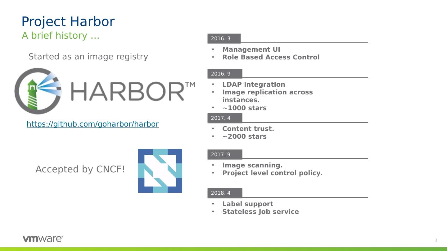 2 .Project Harbor A brief history … https://github.com/goharbor/harbor Accepted by CNCF! Started as an image registry Management UI Role Based Access Control 2016. 3 LDAP integration Image replication across instances. ~1000 stars 2016. 9 Content trust. ~2000 stars 2017. 4 Image scanning. Project level control policy. 2017. 9 Label support Stateless Job service 2018. 4