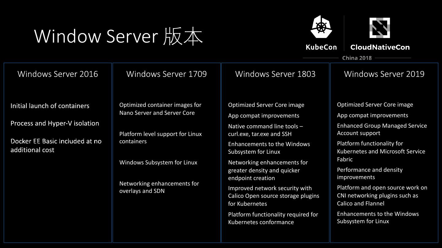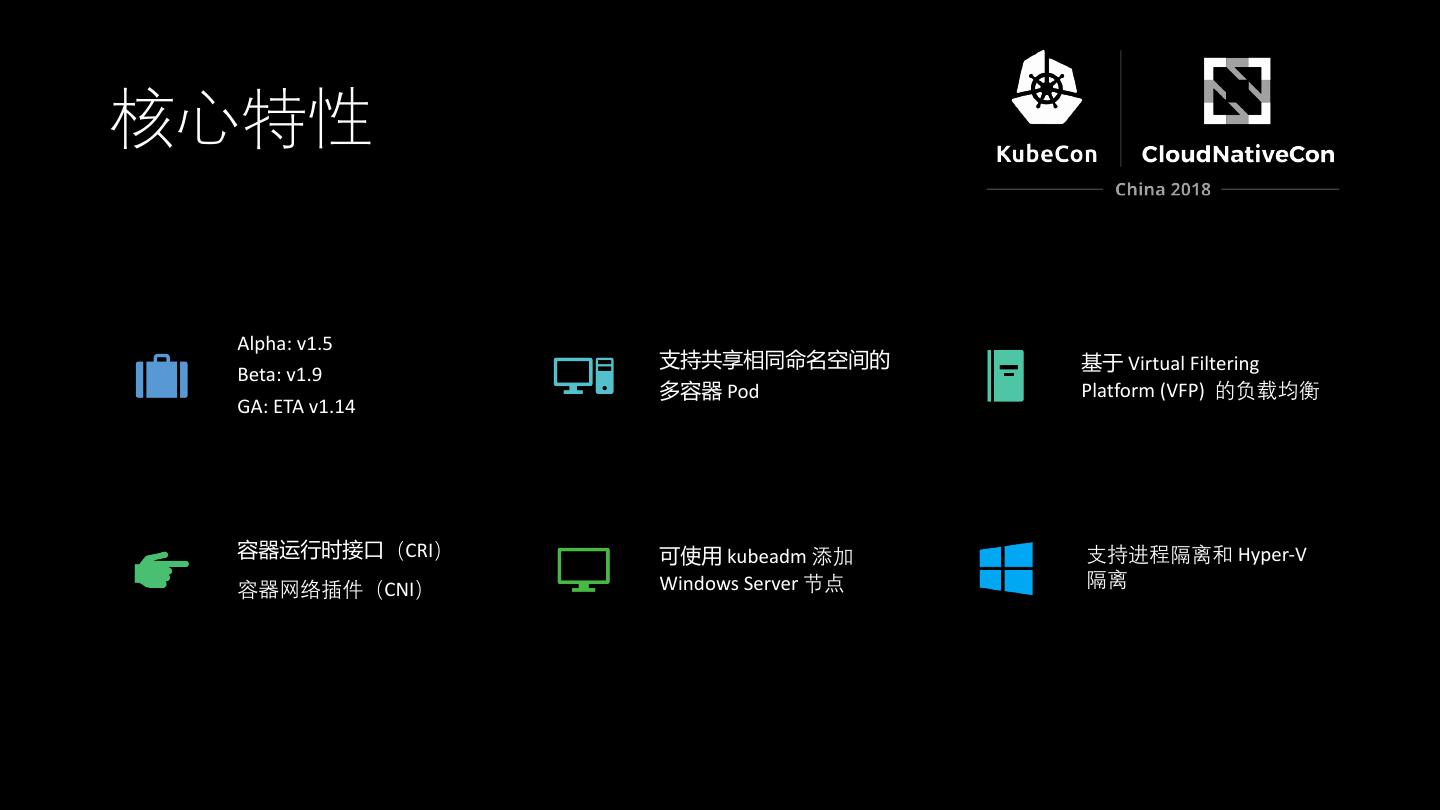 17 .Alpha: v1.5 Virtual Filtering Beta: v1.9 Pod Platform (VFP) GA: ETA v1.14 CRI kubeadm Hyper-V CNI Windows Server