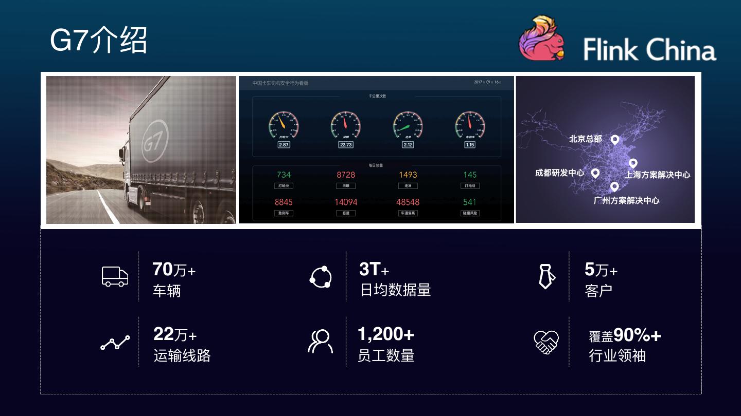 2 .G7介绍 北北京总部 成都研发中⼼心 上海海⽅方案解决中⼼心 ⼴广州⽅方案解决中⼼心 70万+ 3T+ 5万+ ⻋车辆 ⽇日均数据量量 客户 22万+ 1,200+ 覆盖90%+ 运输线路路 员⼯工数量量 ⾏行行业领袖