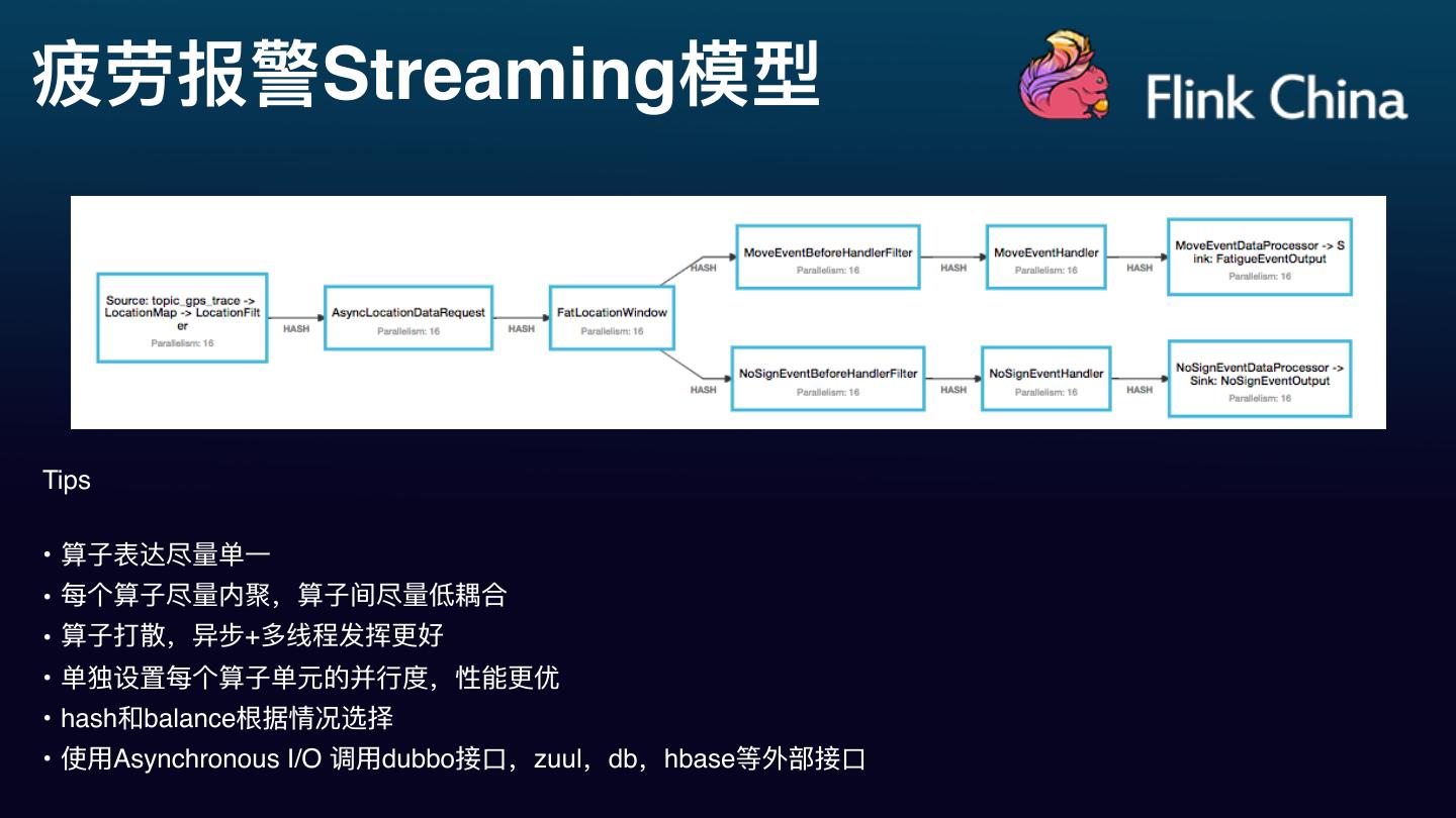 15 .疲劳报警Streaming模型 Tips • 算⼦子表达尽量量单⼀一 • 每个算⼦子尽量量内聚,算⼦子间尽量量低耦合 • 算⼦子打散,异步+多线程发挥更更好 • 单独设置每个算⼦子单元的并⾏行行度,性能更更优 • hash和balance根据情况选择 • 使⽤用Asynchronous I/O 调⽤用dubbo接⼝口,zuul,db,hbase等外部接⼝口
