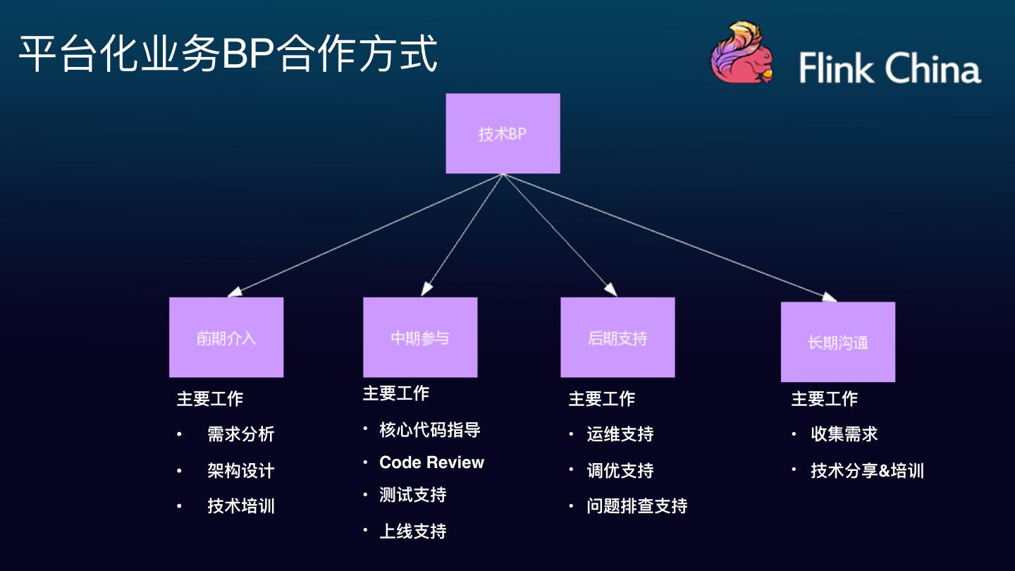 26 .平台化业务BP合作⽅方式 主要⼯工作 主要⼯工作 主要⼯工作 主要⼯工作 • 需求分析 • 核⼼心代码指导 • 运维⽀支持 • 收集需求 • Code Review • 架构设计 • 调优⽀支持 • 技术分享&培训 • 测试⽀支持 • 技术培训 • 问题排查⽀支持 • 上线⽀支持