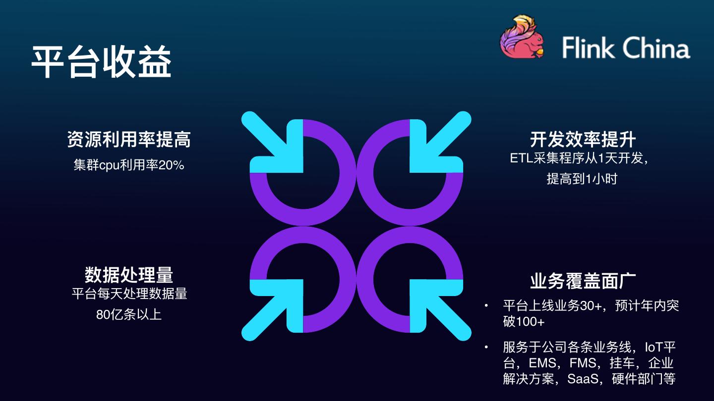 29 .平台收益 资源利利⽤用率提⾼高 开发效率提升 ETL采集程序从1天开发, 集群cpu利利⽤用率20% 提⾼高到1⼩小时 数据处理理量量 业务覆盖⾯面⼴广 平台每天处理理数据量量 • 平台上线业务30+,预计年年内突 80亿条以上 破100+ • 服务于公司各条业务线,IoT平 台,EMS,FMS,挂⻋车,企业 解决⽅方案,SaaS,硬件部⻔门等
