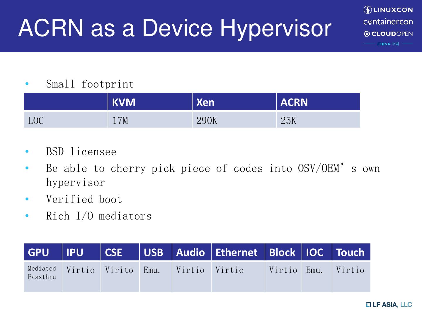 7 .ACRN as a Device Hypervisor • Small footprint KVM Xen ACRN LOC 17M 290K 25K • BSD licensee • Be able to cherry pick piece of codes into OSV/OEM’s own hypervisor • Verified boot • Rich I/O mediators GPU IPU CSE USB Audio Ethernet Block IOC Touch Mediated Virtio Virito Emu. Virtio Virtio Virtio Emu. Virtio Passthru