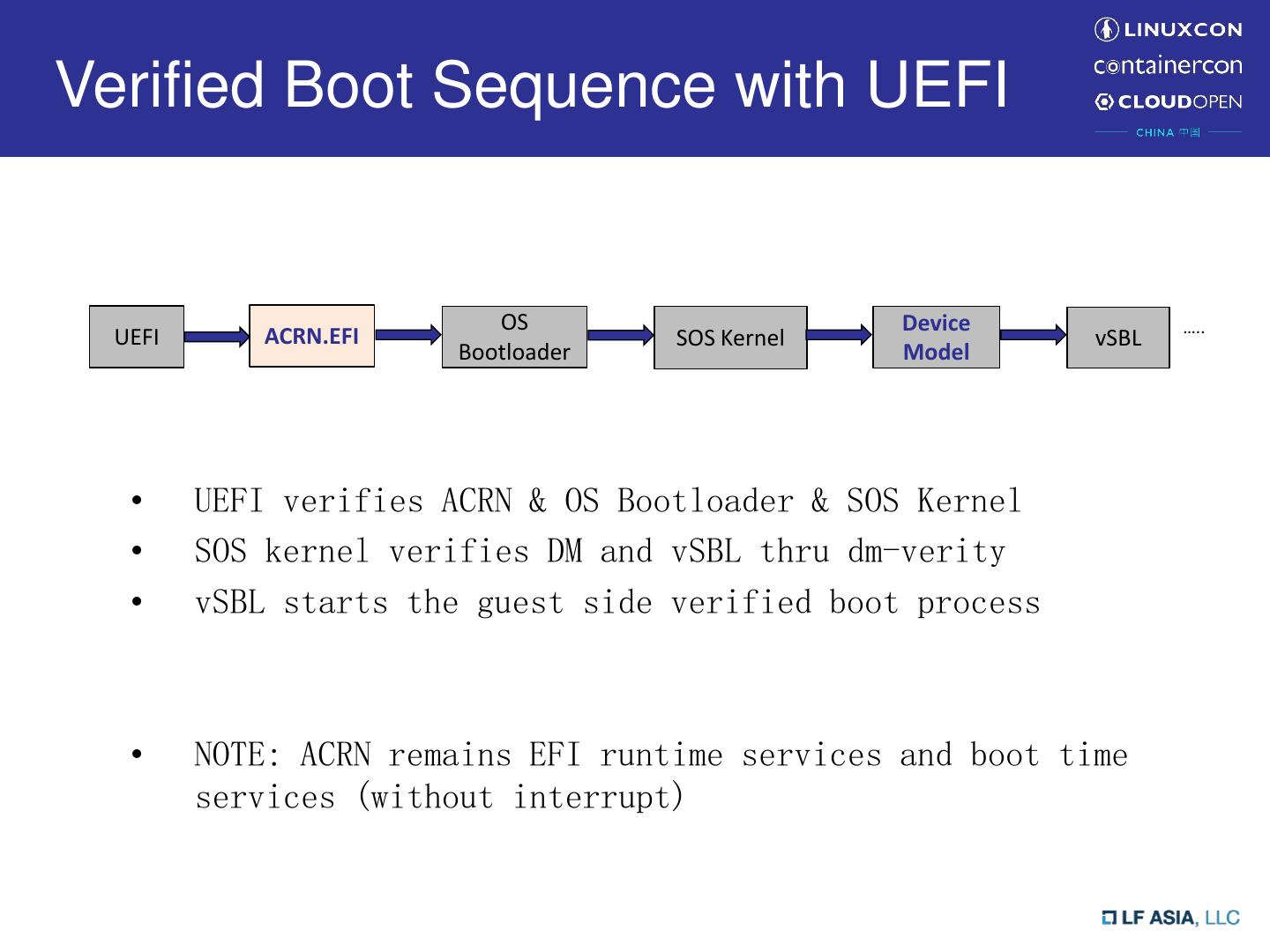9 .Verified Boot Sequence with UEFI OS Device ….. UEFI ACRN.EFI SOS Kernel vSBL Bootloader Model • UEFI verifies ACRN & OS Bootloader & SOS Kernel • SOS kernel verifies DM and vSBL thru dm-verity • vSBL starts the guest side verified boot process • NOTE: ACRN remains EFI runtime services and boot time services (without interrupt)
