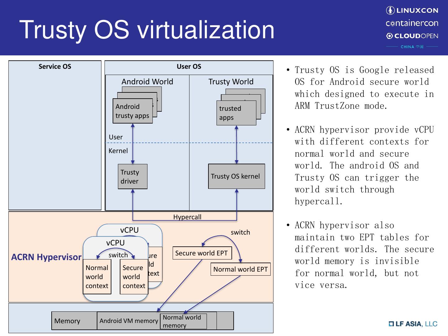 6 . Architecture Overview Service VM Linux Guest VM Android Guest VM Normal Secure World World VM User User Manager ACRN(PIT, Device Model PCI, ACPI ..) (Mediators) Kernel Kernel Keystore User virtio virtio Kernel Keystore FE Drivers FE Drivers Native Device Driver Kernel Mediators VMX non-root Native Device Driver Virtual Firmware Virtual Firmware operation VMX root ACRN Hypervisor VMX Hypercalls operation vPIC/vLAPIC/ VT-d EPT VM API Trusty API vIOAPIC/vMSI Firmware (UEFI, SlimBoot etc.) CSE SOC Platform (Apollo Lake etc.)