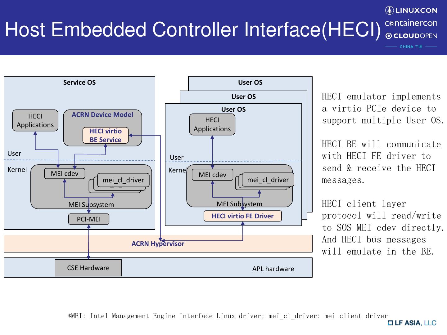 11 .Host Embedded Controller Interface(HECI) Service OS User OS User OS HECI emulator implements User OS a virtio PCIe device to HECI ACRN Device Model Applications HECI support multiple User OS. HECI virtio Applications BE Service HECI BE will communicate User with HECI FE driver to User Kernel MEI cdev Kernel send & receive the HECI MEI cdev mei_cl_driver mei_cl_driver mei_cl_driver mei_cl_driver mei_cl_driver messages. mei_cl_driver MEI Subsystem MEI Subsystem HECI client layer PCI-MEI HECI virtio FE Driver protocol will read/write to SOS MEI cdev directly. ACRN Hypervisor And HECI bus messages will emulate in the BE. CSE Hardware APL hardware *MEI: Intel Management Engine Interface Linux driver; mei_cl_driver: mei client driver