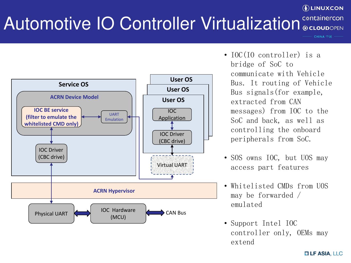 13 .Automotive IO Controller Virtualization • IOC(IO controller) is a bridge of SoC to communicate with Vehicle User OS Service OS Bus. It routing of Vehicle User OS Bus signals(for example, ACRN Device Model User OS extracted from CAN IOC BE service UART IOC messages) from IOC to the (filter to emulate the Application whitelisted CMD only) Emulation SoC and back, as well as IOC Driver controlling the onboard (CBC drive) peripherals from SoC. IOC Driver (CBC drive) • SOS owns IOC, but UOS may Virtual UART access part features • Whitelisted CMDs from UOS ACRN Hypervisor may be forwarded / emulated IOC Hardware CAN Bus Physical UART (MCU) CAN Bus • Support Intel IOC controller only, OEMs may extend
