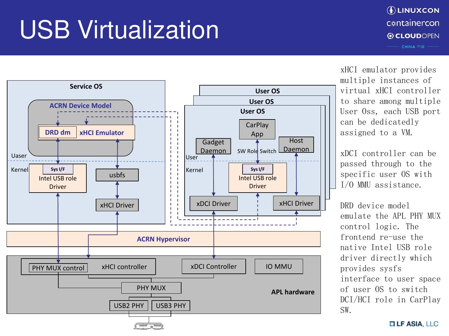 14 . USB Virtualization xHCI emulator provides multiple instances of Service OS User OS virtual xHCI controller ACRN Device Model User OS to share among multiple User UserOS OS User Oss, each USB port CarPlay can be dedicatedly DRD dm xHCI Emulator App assigned to a VM. Gadget Host Daemon SW Role Switch Daemon Uaser User xDCI controller can be passed through to the Kernel Sys I/F Kernel Sys I/F Intel USB role usbfs Intel USB role specific user OS with Driver Driver I/O MMU assistance. xHCI Driver xDCI Driver xHCI Driver DRD device model emulate the APL PHY MUX control logic. The ACRN Hypervisor frontend re-use the native Intel USB role driver directly which PHY MUX control xHCI controller xDCI Controller IO MMU provides sysfs interface to user space PHY MUX APL hardware of user OS to switch DCI/HCI role in CarPlay USB2 PHY USB3 PHY SW.