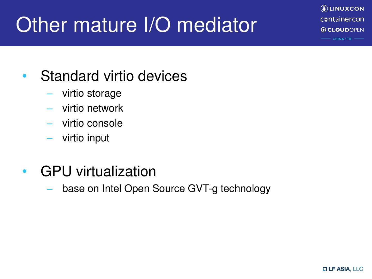 15 .Other mature I/O mediator • Standard virtio devices – virtio storage – virtio network – virtio console – virtio input • GPU virtualization – base on Intel Open Source GVT-g technology