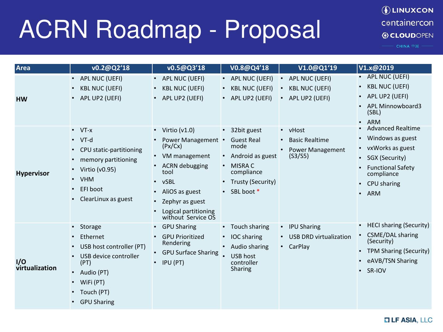 16 .ACRN Roadmap - Proposal Area v0.2@Q2‘18 v0.5@Q3’18 V0.8@Q4’18 V1.0@Q1‘19 V1.x@2019 • APL NUC (UEFI) • APL NUC (UEFI) • APL NUC (UEFI) • APL NUC (UEFI) • APL NUC (UEFI) • KBL NUC (UEFI) • KBL NUC (UEFI) • KBL NUC (UEFI) • KBL NUC (UEFI) • KBL NUC (UEFI) HW • APL UP2 (UEFI) • APL UP2 (UEFI) • APL UP2 (UEFI) • APL UP2 (UEFI) • APL UP2 (UEFI) • APL Minnowboard3 (SBL) • ARM • VT-x • Virtio (v1.0) • 32bit guest • vHost • Advanced Realtime • VT-d • Power Management • Guest Real • Basic Realtime • Windows as guest (Px/Cx) mode • vxWorks as guest • CPU static-partitioning • Power Management • VM management • Android as guest (S3/S5) • SGX (Security) • memory partitioning • ACRN debugging • MISRA C • Functional Safety • Virtio (v0.95) tool compliance Hypervisor compliance • VHM • vSBL • Trusty (Security) • CPU sharing • EFI boot • AliOS as guest • SBL boot * • ARM • ClearLinux as guest • Zephyr as guest • Logical partitioning without Service OS • Storage • GPU Sharing • Touch sharing • IPU Sharing • HECI sharing (Security) • Ethernet • GPU Prioritized • IOC sharing • USB DRD virtualization • CSME/DAL sharing Rendering (Security) • USB host controller (PT) • Audio sharing • CarPlay • GPU Surface Sharing • TPM Sharing (Security) • USB device controller • USB host I/O (PT) • IPU (PT) controller • eAVB/TSN Sharing virtualization Sharing • SR-IOV • Audio (PT) • WiFi (PT) • Touch (PT) • GPU Sharing