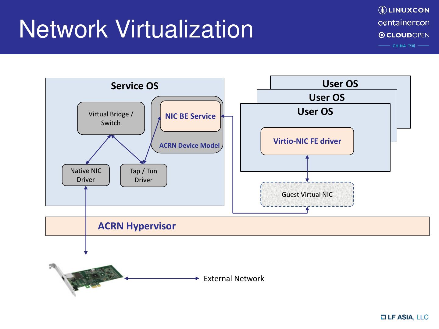22 .Network Virtualization Service OS User OS User OS Virtual Bridge / NIC BE Service User OS Switch ACRN Device Model Virtio-NIC FE driver Native NIC Tap / Tun Driver Driver Guest Virtual NIC ACRN Hypervisor External Network
