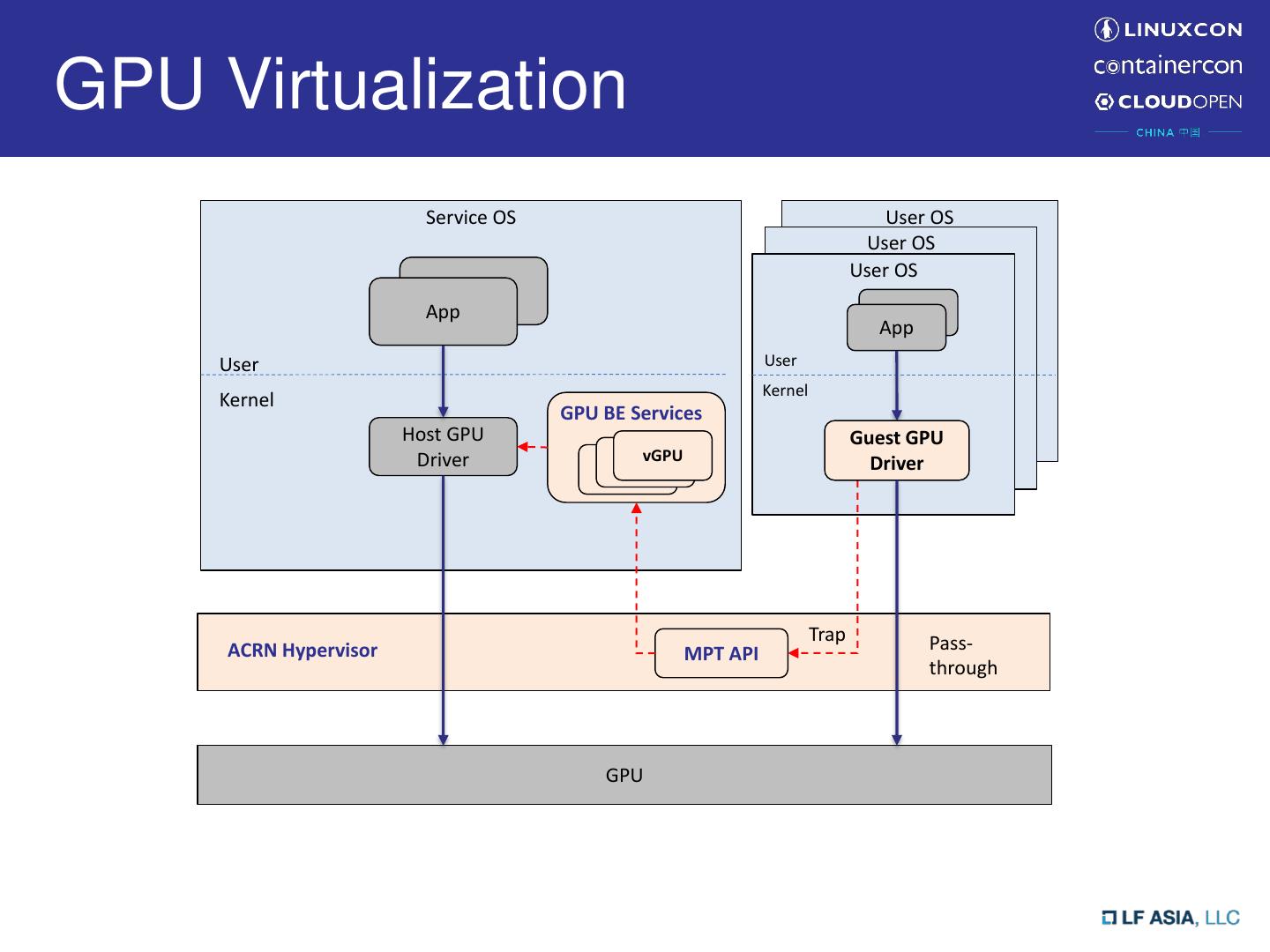 23 .GPU Virtualization Service OS User OS User OS User OS App App App App User User Kernel Kernel GPU BE Services Host GPU Guest GPU Driver vGPU vGPU vGPU Driver Trap Pass- ACRN Hypervisor MPT API through GPU