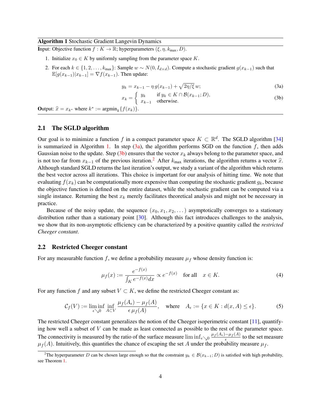4 .Algorithm 1 Stochastic Gradient Langevin Dynamics Input: Objective function f : K → R; hyperparameters (ξ, η, kmax , D). 1. Initialize x0 ∈ K by uniformly sampling from the parameter space K. 2. For each k ∈ {1, 2, . . . , kmax }: Sample w ∼ N (0, Id×d ). Compute a stochastic gradient g(xk−1 ) such that E[g(xk−1 )|xk−1 ] = ∇f (xk−1 ). Then update: yk = xk−1 − η g(xk−1 ) + 2η/ξ w; (3a) yk if yk ∈ K ∩ B(xk−1 ; D), xk = (3b) xk−1 otherwise. Output: x = xk∗ where k ∗ := argmink {f (xk )}. 2.1 The SGLD algorithm Our goal is to minimize a function f in a compact parameter space K ⊂ Rd . The SGLD algorithm [34] is summarized in Algorithm 1. In step (3a), the algorithm performs SGD on the function f , then adds Gaussian noise to the update. Step (3b) ensures that the vector xk always belong to the parameter space, and is not too far from xk−1 of the previous iteration.2 After kmax iterations, the algorithm returns a vector x. Although standard SGLD returns the last iteration’s output, we study a variant of the algorithm which returns the best vector across all iterations. This choice is important for our analysis of hitting time. We note that evaluating f (xk ) can be computationally more expensive than computing the stochastic gradient gk , because the objective function is defined on the entire dataset, while the stochastic gradient can be computed via a single instance. Returning the best xk merely facilitates theoretical analysis and might not be necessary in practice. Because of the noisy update, the sequence (x0 , x1 , x2 , . . . ) asymptotically converges to a stationary distribution rather than a stationary point [30]. Although this fact introduces challenges to the analysis, we show that its non-asymptotic efficiency can be characterized by a positive quantity called the restricted Cheeger constant. 2.2 Restricted Cheeger constant For any measurable function f , we define a probability measure µf whose density function is: e−f (x) µf (x) := −f (x) dx ∝ e−f (x) for all x ∈ K. (4) K e For any function f and any subset V ⊂ K, we define the restricted Cheeger constant as: µf (A ) − µf (A) Cf (V ) := lim inf inf , where A := {x ∈ K : d(x, A) ≤ }. (5) 0 A⊂V µf (A) The restricted Cheeger constant generalizes the notion of the Cheeger isoperimetric constant [11], quantify- ing how well a subset of V can be made as least connected as possible to the rest of the parameter space. µ (A )−µf (A) The connectivity is measured by the ratio of the surface measure lim inf 0 f to the set measure µf (A). Intuitively, this quantifies the chance of escaping the set A under the probability measure µf . 2 The hyperparameter D can be chosen large enough so that the constraint yk ∈ B(xk−1 ; D) is satisfied with high probability, see Theorem 1. 4