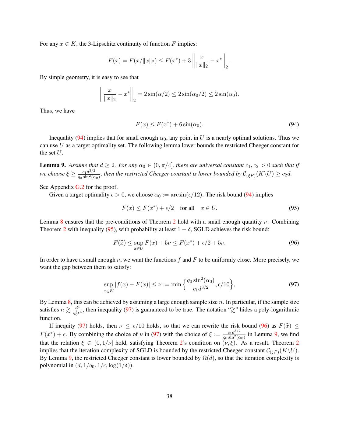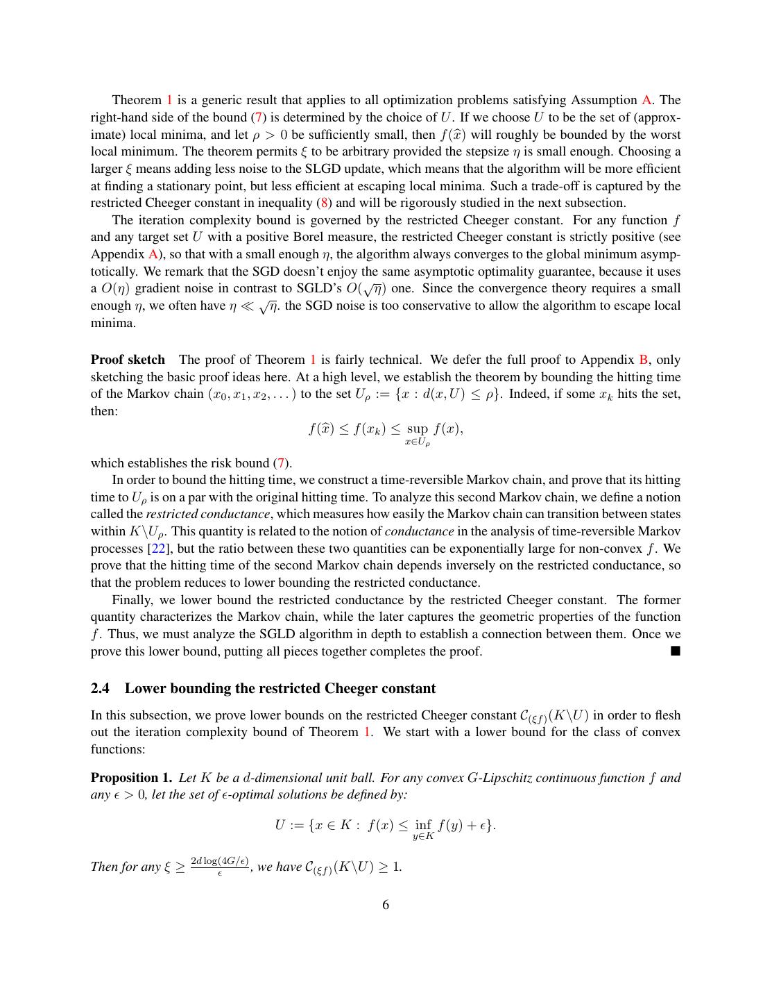 6 . Theorem 1 is a generic result that applies to all optimization problems satisfying Assumption A. The right-hand side of the bound (7) is determined by the choice of U . If we choose U to be the set of (approx- imate) local minima, and let ρ > 0 be sufficiently small, then f (x) will roughly be bounded by the worst local minimum. The theorem permits ξ to be arbitrary provided the stepsize η is small enough. Choosing a larger ξ means adding less noise to the SLGD update, which means that the algorithm will be more efficient at finding a stationary point, but less efficient at escaping local minima. Such a trade-off is captured by the restricted Cheeger constant in inequality (8) and will be rigorously studied in the next subsection. The iteration complexity bound is governed by the restricted Cheeger constant. For any function f and any target set U with a positive Borel measure, the restricted Cheeger constant is strictly positive (see Appendix A), so that with a small enough η, the algorithm always converges to the global minimum asymp- totically. We remark that the SGD doesn’t enjoy the same asymptotic optimality guarantee, because it uses √ a O(η) gradient noise in contrast to SGLD’s O( η) one. Since the convergence theory requires a small √ enough η, we often have η η. the SGD noise is too conservative to allow the algorithm to escape local minima. Proof sketch The proof of Theorem 1 is fairly technical. We defer the full proof to Appendix B, only sketching the basic proof ideas here. At a high level, we establish the theorem by bounding the hitting time of the Markov chain (x0 , x1 , x2 , . . . ) to the set Uρ := {x : d(x, U ) ≤ ρ}. Indeed, if some xk hits the set, then: f (x) ≤ f (xk ) ≤ sup f (x), x∈Uρ which establishes the risk bound (7). In order to bound the hitting time, we construct a time-reversible Markov chain, and prove that its hitting time to Uρ is on a par with the original hitting time. To analyze this second Markov chain, we define a notion called the restricted conductance, which measures how easily the Markov chain can transition between states within K\Uρ . This quantity is related to the notion of conductance in the analysis of time-reversible Markov processes [22], but the ratio between these two quantities can be exponentially large for non-convex f . We prove that the hitting time of the second Markov chain depends inversely on the restricted conductance, so that the problem reduces to lower bounding the restricted conductance. Finally, we lower bound the restricted conductance by the restricted Cheeger constant. The former quantity characterizes the Markov chain, while the later captures the geometric properties of the function f . Thus, we must analyze the SGLD algorithm in depth to establish a connection between them. Once we prove this lower bound, putting all pieces together completes the proof. 2.4 Lower bounding the restricted Cheeger constant In this subsection, we prove lower bounds on the restricted Cheeger constant C(ξf ) (K\U ) in order to flesh out the iteration complexity bound of Theorem 1. We start with a lower bound for the class of convex functions: Proposition 1. Let K be a d-dimensional unit ball. For any convex G-Lipschitz continuous function f and any > 0, let the set of -optimal solutions be defined by: U := {x ∈ K : f (x) ≤ inf f (y) + }. y∈K 2d log(4G/ ) Then for any ξ ≥ , we have C(ξf ) (K\U ) ≥ 1. 6
