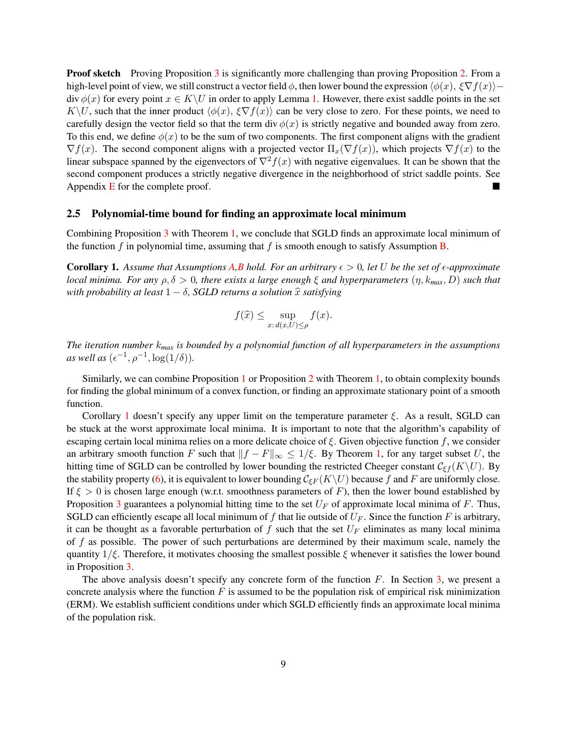 9 .Proof sketch Proving Proposition 3 is significantly more challenging than proving Proposition 2. From a high-level point of view, we still construct a vector field φ, then lower bound the expression φ(x), ξ∇f (x) − div φ(x) for every point x ∈ K\U in order to apply Lemma 1. However, there exist saddle points in the set K\U , such that the inner product φ(x), ξ∇f (x) can be very close to zero. For these points, we need to carefully design the vector field so that the term div φ(x) is strictly negative and bounded away from zero. To this end, we define φ(x) to be the sum of two components. The first component aligns with the gradient ∇f (x). The second component aligns with a projected vector Πx (∇f (x)), which projects ∇f (x) to the linear subspace spanned by the eigenvectors of ∇2 f (x) with negative eigenvalues. It can be shown that the second component produces a strictly negative divergence in the neighborhood of strict saddle points. See Appendix E for the complete proof. 2.5 Polynomial-time bound for finding an approximate local minimum Combining Proposition 3 with Theorem 1, we conclude that SGLD finds an approximate local minimum of the function f in polynomial time, assuming that f is smooth enough to satisfy Assumption B. Corollary 1. Assume that Assumptions A,B hold. For an arbitrary > 0, let U be the set of -approximate local minima. For any ρ, δ > 0, there exists a large enough ξ and hyperparameters (η, kmax , D) such that with probability at least 1 − δ, SGLD returns a solution x satisfying f (x) ≤ sup f (x). x: d(x,U )≤ρ The iteration number kmax is bounded by a polynomial function of all hyperparameters in the assumptions as well as ( −1 , ρ−1 , log(1/δ)). Similarly, we can combine Proposition 1 or Proposition 2 with Theorem 1, to obtain complexity bounds for finding the global minimum of a convex function, or finding an approximate stationary point of a smooth function. Corollary 1 doesn’t specify any upper limit on the temperature parameter ξ. As a result, SGLD can be stuck at the worst approximate local minima. It is important to note that the algorithm’s capability of escaping certain local minima relies on a more delicate choice of ξ. Given objective function f , we consider an arbitrary smooth function F such that f − F ∞ ≤ 1/ξ. By Theorem 1, for any target subset U , the hitting time of SGLD can be controlled by lower bounding the restricted Cheeger constant Cξf (K\U ). By the stability property (6), it is equivalent to lower bounding CξF (K\U ) because f and F are uniformly close. If ξ > 0 is chosen large enough (w.r.t. smoothness parameters of F ), then the lower bound established by Proposition 3 guarantees a polynomial hitting time to the set UF of approximate local minima of F . Thus, SGLD can efficiently escape all local minimum of f that lie outside of UF . Since the function F is arbitrary, it can be thought as a favorable perturbation of f such that the set UF eliminates as many local minima of f as possible. The power of such perturbations are determined by their maximum scale, namely the quantity 1/ξ. Therefore, it motivates choosing the smallest possible ξ whenever it satisfies the lower bound in Proposition 3. The above analysis doesn’t specify any concrete form of the function F . In Section 3, we present a concrete analysis where the function F is assumed to be the population risk of empirical risk minimization (ERM). We establish sufficient conditions under which SGLD efficiently finds an approximate local minima of the population risk. 9
