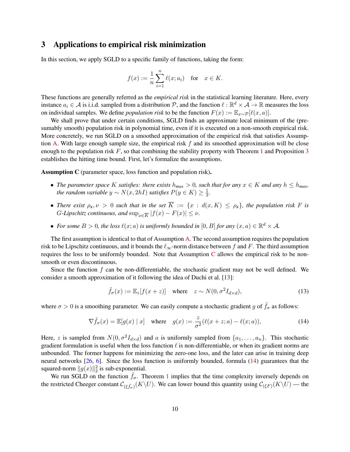 10 .3 Applications to empirical risk minimization In this section, we apply SGLD to a specific family of functions, taking the form: n 1 f (x) := (x; ai ) for x ∈ K. n i=1 These functions are generally referred as the empirical risk in the statistical learning literature. Here, every instance ai ∈ A is i.i.d. sampled from a distribution P, and the function : Rd × A → R measures the loss on individual samples. We define population risk to be the function F (x) := Ex∼P [ (x, a)]. We shall prove that under certain conditions, SGLD finds an approximate local minimum of the (pre- sumably smooth) population risk in polynomial time, even if it is executed on a non-smooth empirical risk. More concretely, we run SGLD on a smoothed approximation of the empirical risk that satisfies Assump- tion A. With large enough sample size, the empirical risk f and its smoothed approximation will be close enough to the population risk F , so that combining the stability property with Theorem 1 and Proposition 3 establishes the hitting time bound. First, let’s formalize the assumptions. Assumption C (parameter space, loss function and population risk). • The parameter space K satisfies: there exists hmax > 0, such that for any x ∈ K and any h ≤ hmax , the random variable y ∼ N (x, 2hI) satisfies P (y ∈ K) ≥ 31 . • There exist ρK , ν > 0 such that in the set K := {x : d(x, K) ≤ ρK }, the population risk F is G-Lipschitz continuous, and supx∈K |f (x) − F (x)| ≤ ν. • For some B > 0, the loss (x; a) is uniformly bounded in [0, B] for any (x, a) ∈ Rd × A. The first assumption is identical to that of Assumption A. The second assumption requires the population risk to be Lipschitz continuous, and it bounds the ∞ -norm distance between f and F . The third assumption requires the loss to be uniformly bounded. Note that Assumption C allows the empirical risk to be non- smooth or even discontinuous. Since the function f can be non-differentiable, the stochastic gradient may not be well defined. We consider a smooth approximation of it following the idea of Duchi et al. [13]: f˜σ (x) := Ez [f (x + z)] where z ∼ N (0, σ 2 Id×d ), (13) where σ > 0 is a smoothing parameter. We can easily compute a stochastic gradient g of f˜σ as follows: z ∇f˜σ (x) = E[g(x) | x] where g(x) := ( (x + z; a) − (x; a)), (14) σ2 Here, z is sampled from N (0, σ 2 Id×d ) and a is uniformly sampled from {a1 , . . . , an }. This stochastic gradient formulation is useful when the loss function is non-differentiable, or when its gradient norms are unbounded. The former happens for minimizing the zero-one loss, and the later can arise in training deep neural networks [26, 6]. Since the loss function is uniformly bounded, formula (14) guarantees that the squared-norm g(x) 22 is sub-exponential. We run SGLD on the function f˜σ . Theorem 1 implies that the time complexity inversely depends on the restricted Cheeger constant C(ξf˜σ ) (K\U ). We can lower bound this quantity using C(ξF ) (K\U ) — the 10
