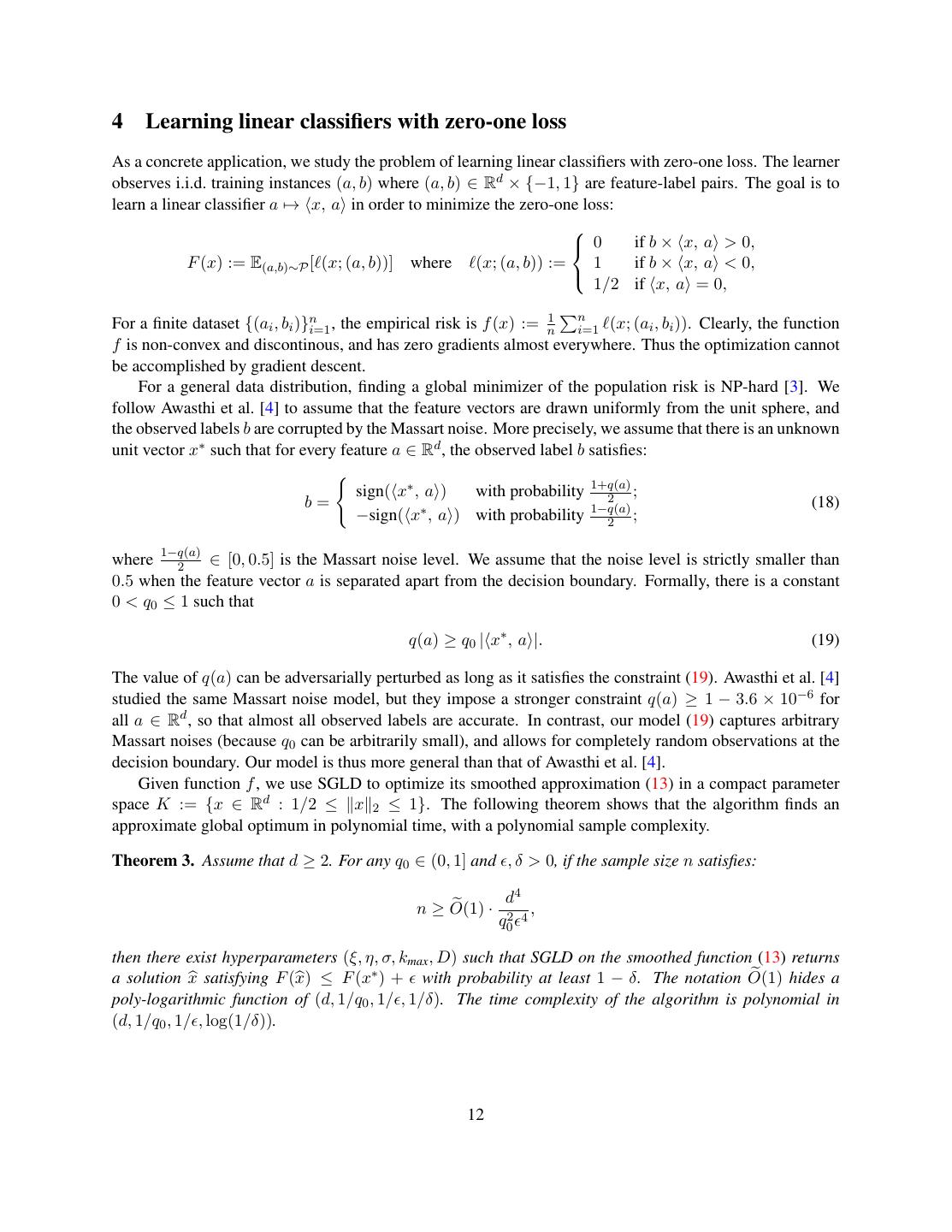 12 .4 Learning linear classifiers with zero-one loss As a concrete application, we study the problem of learning linear classifiers with zero-one loss. The learner observes i.i.d. training instances (a, b) where (a, b) ∈ Rd × {−1, 1} are feature-label pairs. The goal is to learn a linear classifier a → x, a in order to minimize the zero-one loss: 0 if b × x, a > 0, F (x) := E(a,b)∼P [ (x; (a, b))] where (x; (a, b)) := 1 if b × x, a < 0, 1/2 if x, a = 0, For a finite dataset {(ai , bi )}ni=1 , the empirical risk is f (x) := n1 ni=1 (x; (ai , bi )). Clearly, the function f is non-convex and discontinous, and has zero gradients almost everywhere. Thus the optimization cannot be accomplished by gradient descent. For a general data distribution, finding a global minimizer of the population risk is NP-hard [3]. We follow Awasthi et al. [4] to assume that the feature vectors are drawn uniformly from the unit sphere, and the observed labels b are corrupted by the Massart noise. More precisely, we assume that there is an unknown unit vector x∗ such that for every feature a ∈ Rd , the observed label b satisfies: 1+q(a) sign( x∗ , a ) with probability 2 ; b= ∗ 1−q(a) (18) −sign( x , a ) with probability 2 ; where 1−q(a) 2 ∈ [0, 0.5] is the Massart noise level. We assume that the noise level is strictly smaller than 0.5 when the feature vector a is separated apart from the decision boundary. Formally, there is a constant 0 < q0 ≤ 1 such that q(a) ≥ q0 | x∗ , a |. (19) The value of q(a) can be adversarially perturbed as long as it satisfies the constraint (19). Awasthi et al. [4] studied the same Massart noise model, but they impose a stronger constraint q(a) ≥ 1 − 3.6 × 10−6 for all a ∈ Rd , so that almost all observed labels are accurate. In contrast, our model (19) captures arbitrary Massart noises (because q0 can be arbitrarily small), and allows for completely random observations at the decision boundary. Our model is thus more general than that of Awasthi et al. [4]. Given function f , we use SGLD to optimize its smoothed approximation (13) in a compact parameter space K := {x ∈ Rd : 1/2 ≤ x 2 ≤ 1}. The following theorem shows that the algorithm finds an approximate global optimum in polynomial time, with a polynomial sample complexity. Theorem 3. Assume that d ≥ 2. For any q0 ∈ (0, 1] and , δ > 0, if the sample size n satisfies: d4 n ≥ O(1) · , q02 4 then there exist hyperparameters (ξ, η, σ, kmax , D) such that SGLD on the smoothed function (13) returns a solution x satisfying F (x) ≤ F (x∗ ) + with probability at least 1 − δ. The notation O(1) hides a poly-logarithmic function of (d, 1/q0 , 1/ , 1/δ). The time complexity of the algorithm is polynomial in (d, 1/q0 , 1/ , log(1/δ)). 12