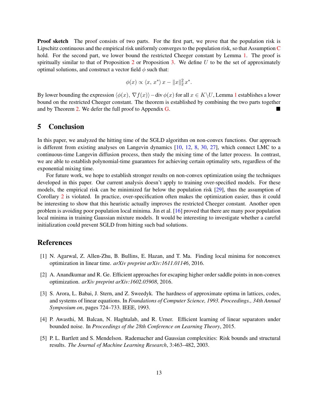 13 .Proof sketch The proof consists of two parts. For the first part, we prove that the population risk is Lipschitz continuous and the empirical risk uniformly converges to the population risk, so that Assumption C hold. For the second part, we lower bound the restricted Cheeger constant by Lemma 1. The proof is spiritually similar to that of Proposition 2 or Proposition 3. We define U to be the set of approximately optimal solutions, and construct a vector field φ such that: φ(x) ∝ x, x∗ x − x 2 ∗ 2x . By lower bounding the expression φ(x), ∇f (x) −div φ(x) for all x ∈ K\U , Lemma 1 establishes a lower bound on the restricted Cheeger constant. The theorem is established by combining the two parts together and by Theorem 2. We defer the full proof to Appendix G. 5 Conclusion In this paper, we analyzed the hitting time of the SGLD algorithm on non-convex functions. Our approach is different from existing analyses on Langevin dynamics [10, 12, 8, 30, 27], which connect LMC to a continuous-time Langevin diffusion process, then study the mixing time of the latter process. In contrast, we are able to establish polynomial-time guarantees for achieving certain optimality sets, regardless of the exponential mixing time. For future work, we hope to establish stronger results on non-convex optimization using the techniques developed in this paper. Our current analysis doesn’t apply to training over-specified models. For these models, the empirical risk can be minimized far below the population risk [29], thus the assumption of Corollary 2 is violated. In practice, over-specification often makes the optimization easier, thus it could be interesting to show that this heuristic actually improves the restricted Cheeger constant. Another open problem is avoiding poor population local minima. Jin et al. [16] proved that there are many poor population local minima in training Gaussian mixture models. It would be interesting to investigate whether a careful initialization could prevent SGLD from hitting such bad solutions. References [1] N. Agarwal, Z. Allen-Zhu, B. Bullins, E. Hazan, and T. Ma. Finding local minima for nonconvex optimization in linear time. arXiv preprint arXiv:1611.01146, 2016. [2] A. Anandkumar and R. Ge. Efficient approaches for escaping higher order saddle points in non-convex optimization. arXiv preprint arXiv:1602.05908, 2016. [3] S. Arora, L. Babai, J. Stern, and Z. Sweedyk. The hardness of approximate optima in lattices, codes, and systems of linear equations. In Foundations of Computer Science, 1993. Proceedings., 34th Annual Symposium on, pages 724–733. IEEE, 1993. [4] P. Awasthi, M. Balcan, N. Haghtalab, and R. Urner. Efficient learning of linear separators under bounded noise. In Proceedings of the 28th Conference on Learning Theory, 2015. [5] P. L. Bartlett and S. Mendelson. Rademacher and Gaussian complexities: Risk bounds and structural results. The Journal of Machine Learning Research, 3:463–482, 2003. 13