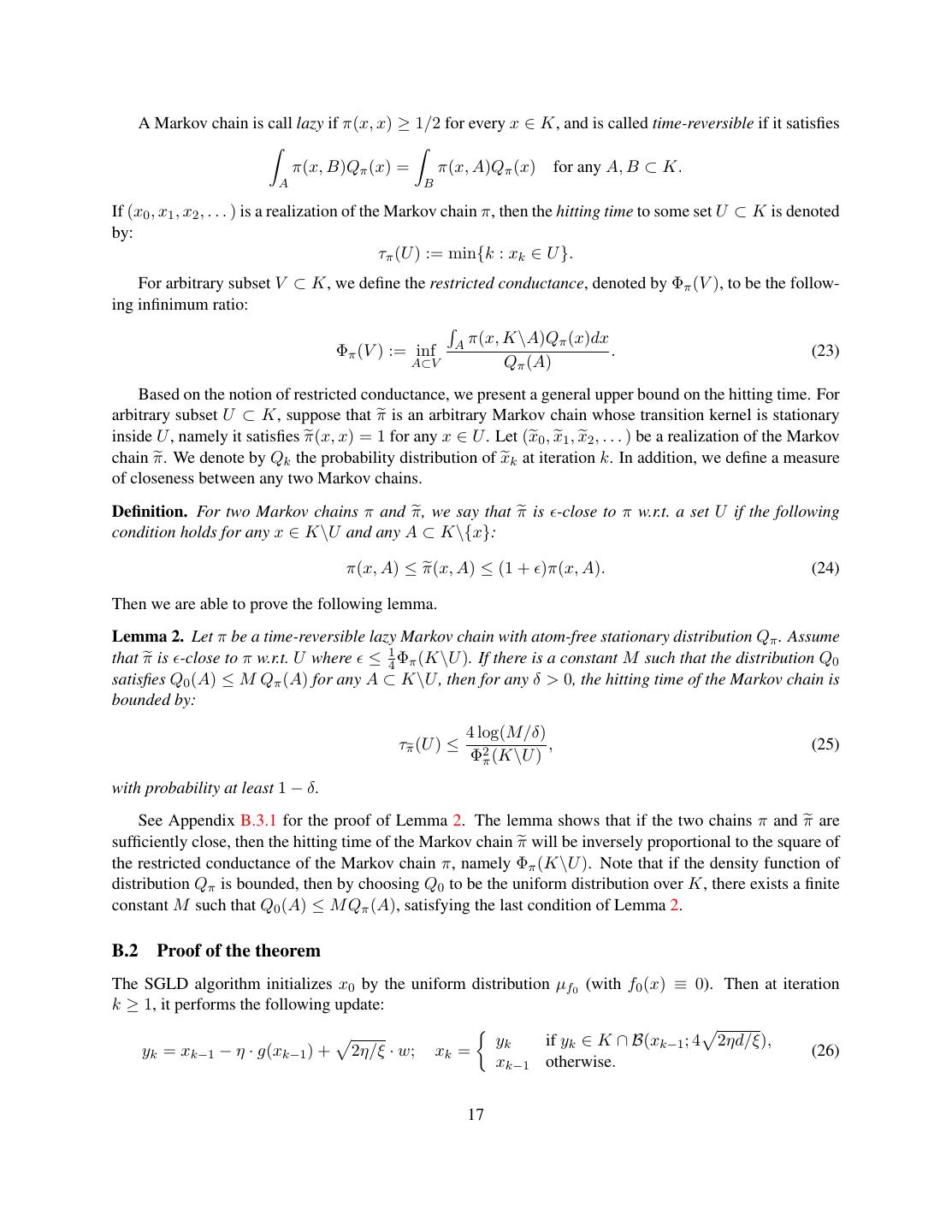17 . A Markov chain is call lazy if π(x, x) ≥ 1/2 for every x ∈ K, and is called time-reversible if it satisfies π(x, B)Qπ (x) = π(x, A)Qπ (x) for any A, B ⊂ K. A B If (x0 , x1 , x2 , . . . ) is a realization of the Markov chain π, then the hitting time to some set U ⊂ K is denoted by: τπ (U ) := min{k : xk ∈ U }. For arbitrary subset V ⊂ K, we define the restricted conductance, denoted by Φπ (V ), to be the follow- ing infinimum ratio: A π(x, K\A)Qπ (x)dx Φπ (V ) := inf . (23) A⊂V Qπ (A) Based on the notion of restricted conductance, we present a general upper bound on the hitting time. For arbitrary subset U ⊂ K, suppose that π is an arbitrary Markov chain whose transition kernel is stationary inside U , namely it satisfies π(x, x) = 1 for any x ∈ U . Let (x0 , x1 , x2 , . . . ) be a realization of the Markov chain π. We denote by Qk the probability distribution of xk at iteration k. In addition, we define a measure of closeness between any two Markov chains. Definition. For two Markov chains π and π, we say that π is -close to π w.r.t. a set U if the following condition holds for any x ∈ K\U and any A ⊂ K\{x}: π(x, A) ≤ π(x, A) ≤ (1 + )π(x, A). (24) Then we are able to prove the following lemma. Lemma 2. Let π be a time-reversible lazy Markov chain with atom-free stationary distribution Qπ . Assume that π is -close to π w.r.t. U where ≤ 41 Φπ (K\U ). If there is a constant M such that the distribution Q0 satisfies Q0 (A) ≤ M Qπ (A) for any A ⊂ K\U , then for any δ > 0, the hitting time of the Markov chain is bounded by: 4 log(M/δ) τπ (U ) ≤ , (25) Φ2π (K\U ) with probability at least 1 − δ. See Appendix B.3.1 for the proof of Lemma 2. The lemma shows that if the two chains π and π are sufficiently close, then the hitting time of the Markov chain π will be inversely proportional to the square of the restricted conductance of the Markov chain π, namely Φπ (K\U ). Note that if the density function of distribution Qπ is bounded, then by choosing Q0 to be the uniform distribution over K, there exists a finite constant M such that Q0 (A) ≤ M Qπ (A), satisfying the last condition of Lemma 2. B.2 Proof of the theorem The SGLD algorithm initializes x0 by the uniform distribution µf0 (with f0 (x) ≡ 0). Then at iteration k ≥ 1, it performs the following update: yk if yk ∈ K ∩ B(xk−1 ; 4 2ηd/ξ), yk = xk−1 − η · g(xk−1 ) + 2η/ξ · w; xk = (26) xk−1 otherwise. 17