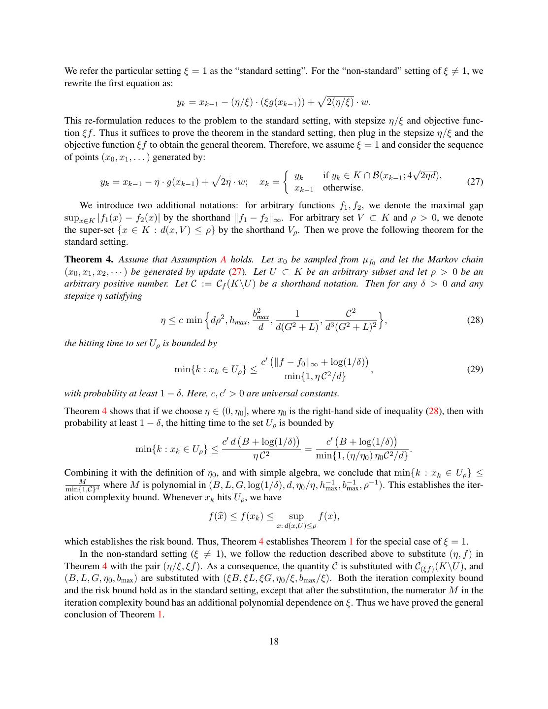 18 .We refer the particular setting ξ = 1 as the “standard setting”. For the “non-standard” setting of ξ = 1, we rewrite the first equation as: yk = xk−1 − (η/ξ) · (ξg(xk−1 )) + 2(η/ξ) · w. This re-formulation reduces to the problem to the standard setting, with stepsize η/ξ and objective func- tion ξf . Thus it suffices to prove the theorem in the standard setting, then plug in the stepsize η/ξ and the objective function ξf to obtain the general theorem. Therefore, we assume ξ = 1 and consider the sequence of points (x0 , x1 , . . . ) generated by: √ yk if yk ∈ K ∩ B(xk−1 ; 4 2ηd), yk = xk−1 − η · g(xk−1 ) + 2η · w; xk = (27) xk−1 otherwise. We introduce two additional notations: for arbitrary functions f1 , f2 , we denote the maximal gap supx∈K |f1 (x) − f2 (x)| by the shorthand f1 − f2 ∞ . For arbitrary set V ⊂ K and ρ > 0, we denote the super-set {x ∈ K : d(x, V ) ≤ ρ} by the shorthand Vρ . Then we prove the following theorem for the standard setting. Theorem 4. Assume that Assumption A holds. Let x0 be sampled from µf0 and let the Markov chain (x0 , x1 , x2 , · · · ) be generated by update (27). Let U ⊂ K be an arbitrary subset and let ρ > 0 be an arbitrary positive number. Let C := Cf (K\U ) be a shorthand notation. Then for any δ > 0 and any stepsize η satisfying b2max 1 C2 η ≤ c min dρ2 , hmax , , , , (28) d d(G2 + L) d3 (G2 + L)2 the hitting time to set Uρ is bounded by c f − f0 ∞ + log(1/δ) min{k : xk ∈ Uρ } ≤ , (29) min{1, η C 2 /d} with probability at least 1 − δ. Here, c, c > 0 are universal constants. Theorem 4 shows that if we choose η ∈ (0, η0 ], where η0 is the right-hand side of inequality (28), then with probability at least 1 − δ, the hitting time to the set Uρ is bounded by c d B + log(1/δ) c B + log(1/δ) min{k : xk ∈ Uρ } ≤ 2 = . ηC min{1, (η/η0 ) η0 C 2 /d} Combining it with the definition of η0 , and with simple algebra, we conclude that min{k : xk ∈ Uρ } ≤ M min{1,C}4 where M is polynomial in (B, L, G, log(1/δ), d, η0 /η, h−1 −1 −1 max , bmax , ρ ). This establishes the iter- ation complexity bound. Whenever xk hits Uρ , we have f (x) ≤ f (xk ) ≤ sup f (x), x: d(x,U )≤ρ which establishes the risk bound. Thus, Theorem 4 establishes Theorem 1 for the special case of ξ = 1. In the non-standard setting (ξ = 1), we follow the reduction described above to substitute (η, f ) in Theorem 4 with the pair (η/ξ, ξf ). As a consequence, the quantity C is substituted with C(ξf ) (K\U ), and (B, L, G, η0 , bmax ) are substituted with (ξB, ξL, ξG, η0 /ξ, bmax /ξ). Both the iteration complexity bound and the risk bound hold as in the standard setting, except that after the substitution, the numerator M in the iteration complexity bound has an additional polynomial dependence on ξ. Thus we have proved the general conclusion of Theorem 1. 18