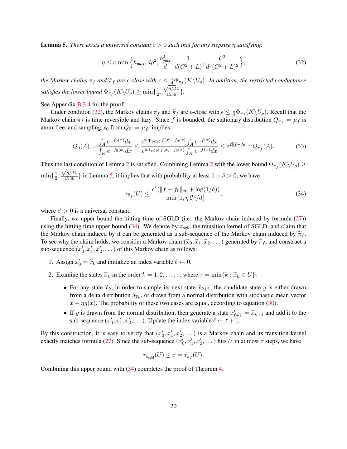 20 .Lemma 5. There exists a universal constant c > 0 such that for any stepsize η satisfying: b2max 1 C2 η ≤ c min hmax , dρ2 , , , , (32) d d(G2 + L) d3 (G2 + L)2 the Markov chains πf and πf are -close with ≤ 14 Φπf (K\Uρ ). In addition, the restricted conductance √ 1 η/d C satisfies the lower bound Φπf (K\Uρ ) ≥ min{ 2 , 1536 }. See Appendix B.3.4 for the proof. Under condition (32), the Markov chains πf and πf are -close with ≤ 41 Φπf (K\Uρ ). Recall that the Markov chain πf is time-reversible and lazy. Since f is bounded, the stationary distribution Qπf = µf is atom-free, and sampling x0 from Q0 := µf0 implies: −f0 (x) dx esupx∈K f (x)−f0 (x) −f (x) dx Ae Ae f −f0 Q0 (A) = −f0 (x) dx ≤ −f (x) dx ≤ e2 ∞ Qπf (A). (33) Ke einf x∈K f (x)−f0 (x) Ke Thus the last condition of Lemma 2 is satisfied. Combining Lemma 2 with the lower bound Φπf (K\Uρ ) ≥ √ 1 η/d C min{ 2 , 1536 } in Lemma 5, it implies that with probability at least 1 − δ > 0, we have c ( f − f0 ∞ + log(1/δ)) τπf (U ) ≤ , (34) min{1, η C 2 /d} where c > 0 is a universal constant. Finally, we upper bound the hitting time of SGLD (i.e., the Markov chain induced by formula (27)) using the hitting time upper bound (34). We denote by πsgld the transition kernel of SGLD, and claim that the Markov chain induced by it can be generated as a sub-sequence of the Markov chain induced by πf . To see why the claim holds, we consider a Markov chain (x0 , x1 , x2 , . . . ) generated by πf , and construct a sub-sequence (x0 , x1 , x2 , . . . ) of this Markov chain as follows: 1. Assign x0 = x0 and initialize an index variable ← 0. 2. Examine the states xk in the order k = 1, 2, . . . , τ , where τ = min{k : xk ∈ U }: • For any state xk , in order to sample its next state xk+1 , the candidate state y is either drawn from a delta distribution δxk , or drawn from a normal distribution with stochastic mean vector x − ηg(x). The probability of these two cases are equal, according to equation (30). • If y is drawn from the normal distribution, then generate a state x +1 = xk+1 and add it to the sub-sequence (x0 , x1 , x2 , . . . ). Update the index variable ← + 1. By this construction, it is easy to verify that (x0 , x1 , x2 , . . . ) is a Markov chain and its transition kernel exactly matches formula (27). Since the sub-sequence (x0 , x1 , x2 , . . . ) hits U in at most τ steps, we have τπsgld (U ) ≤ τ = τπf (U ). Combining this upper bound with (34) completes the proof of Theorem 4. 20