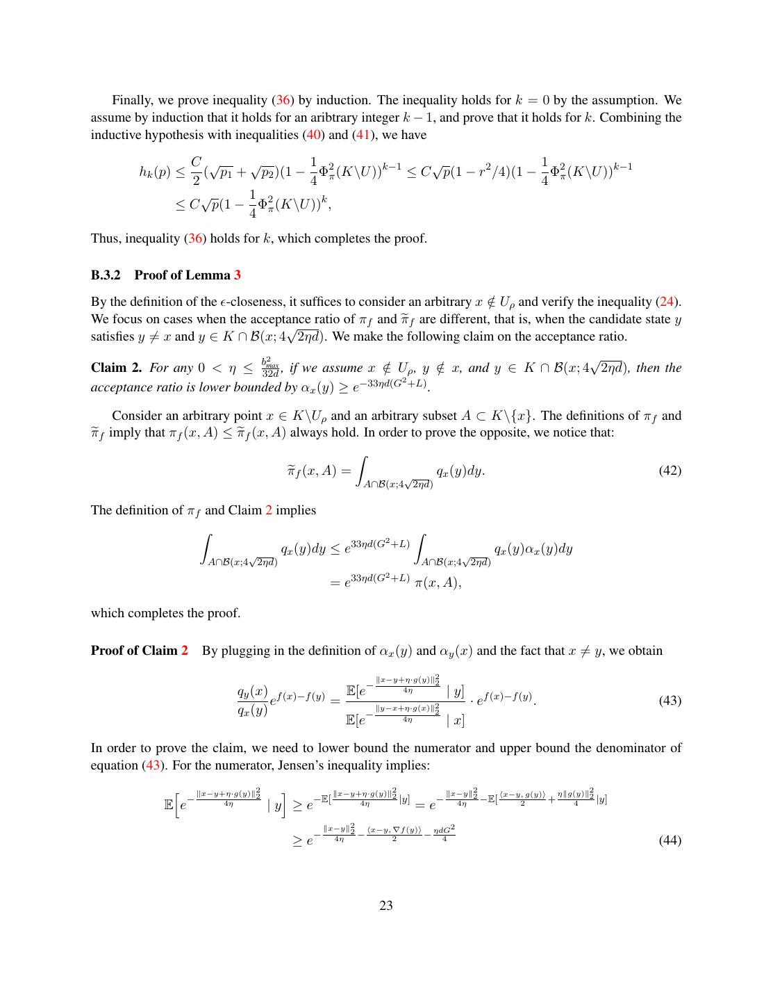 23 . Finally, we prove inequality (36) by induction. The inequality holds for k = 0 by the assumption. We assume by induction that it holds for an aribtrary integer k − 1, and prove that it holds for k. Combining the inductive hypothesis with inequalities (40) and (41), we have C √ √ 1 √ 1 hk (p) ≤ ( p1 + p2 )(1 − Φ2π (K\U ))k−1 ≤ C p(1 − r2 /4)(1 − Φ2π (K\U ))k−1 2 4 4 √ 1 2 ≤ C p(1 − Φπ (K\U ))k , 4 Thus, inequality (36) holds for k, which completes the proof. B.3.2 Proof of Lemma 3 By the definition of the -closeness, it suffices to consider an arbitrary x ∈ / Uρ and verify the inequality (24). √ ratio of πf and πf are different, that is, when the candidate state y We focus on cases when the acceptance satisfies y = x and y ∈ K ∩ B(x; 4 2ηd). We make the following claim on the acceptance ratio. 2 √ Claim 2. For any 0 < η ≤ b32d max , if we assume x ∈ / Uρ , y ∈ / x, and y ∈ K ∩ B(x; 4 2ηd), then the 2 acceptance ratio is lower bounded by αx (y) ≥ e−33ηd(G +L) . Consider an arbitrary point x ∈ K\Uρ and an arbitrary subset A ⊂ K\{x}. The definitions of πf and πf imply that πf (x, A) ≤ πf (x, A) always hold. In order to prove the opposite, we notice that: πf (x, A) = √ qx (y)dy. (42) A∩B(x;4 2ηd) The definition of πf and Claim 2 implies 2 +L) √ qx (y)dy ≤ e33ηd(G √ qx (y)αx (y)dy A∩B(x;4 2ηd) A∩B(x;4 2ηd) 2 +L) = e33ηd(G π(x, A), which completes the proof. Proof of Claim 2 By plugging in the definition of αx (y) and αy (x) and the fact that x = y, we obtain x−y+η·g(y) 2 2 − qy (x) f (x)−f (y) E[e 4η | y] e = y−x+η·g(x) 2 · ef (x)−f (y) . (43) qx (y) − 2 E[e 4η | x] In order to prove the claim, we need to lower bound the numerator and upper bound the denominator of equation (43). For the numerator, Jensen’s inequality implies: x−y+η·g(y) 2 2 x−y+η·g(y) 2 2 |y] x−y 2 2 −E[ x−y, g(y) η g(y) 2 2 |y] − −E[ − + E e 4η |y ≥e 4η =e 4η 2 4 x−y 2 2 − x−y, ∇f (y) 2 − − ηdG ≥e 4η 2 4 (44) 23