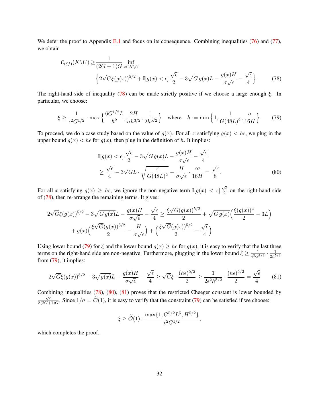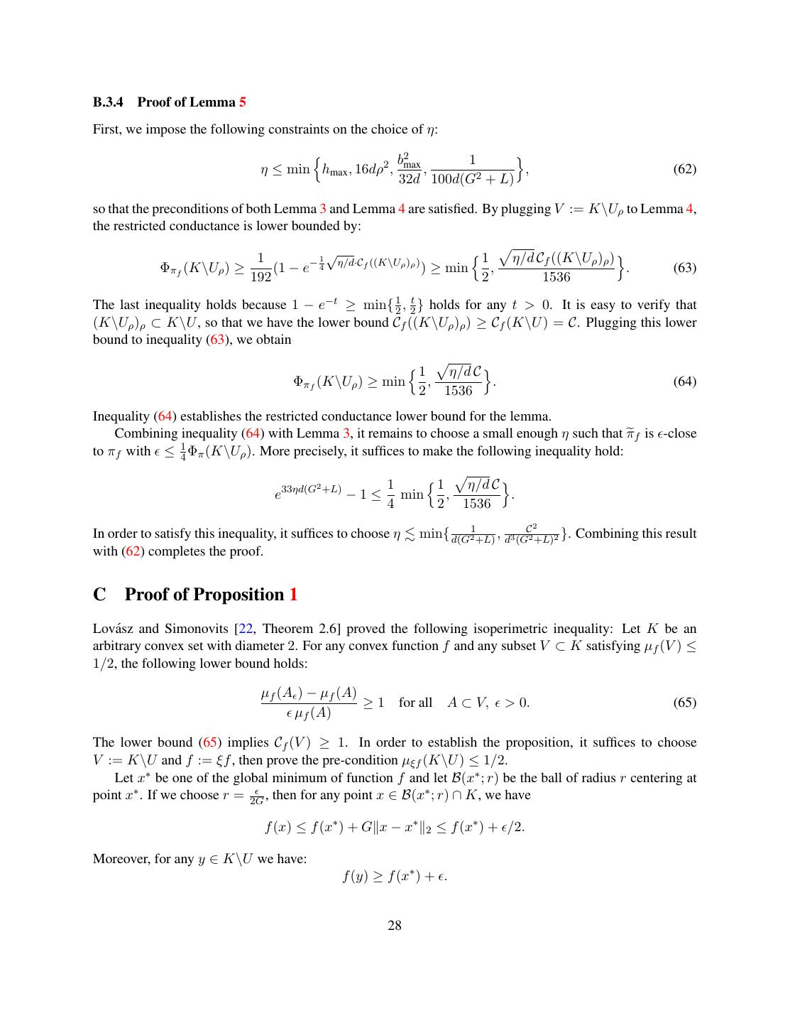 28 .B.3.4 Proof of Lemma 5 First, we impose the following constraints on the choice of η: b2max 1 η ≤ min hmax , 16dρ2 , , , (62) 32d 100d(G2 + L) so that the preconditions of both Lemma 3 and Lemma 4 are satisfied. By plugging V := K\Uρ to Lemma 4, the restricted conductance is lower bounded by: 1 1 √ 1 η/d Cf ((K\Uρ )ρ ) Φπf (K\Uρ ) ≥ (1 − e− 4 η/d·Cf ((K\Uρ )ρ ) ) ≥ min , . (63) 192 2 1536 The last inequality holds because 1 − e−t ≥ min{ 12 , 2t } holds for any t > 0. It is easy to verify that (K\Uρ )ρ ⊂ K\U , so that we have the lower bound Cf ((K\Uρ )ρ ) ≥ Cf (K\U ) = C. Plugging this lower bound to inequality (63), we obtain 1 η/d C Φπf (K\Uρ ) ≥ min , . (64) 2 1536 Inequality (64) establishes the restricted conductance lower bound for the lemma. Combining inequality (64) with Lemma 3, it remains to choose a small enough η such that πf is -close to πf with ≤ 41 Φπ (K\Uρ ). More precisely, it suffices to make the following inequality hold: 2 +L) 1 1 η/d C e33ηd(G −1≤ min , . 4 2 1536 2 In order to satisfy this inequality, it suffices to choose η min{ d(G21+L) , d3 (GC2 +L)2 }. Combining this result with (62) completes the proof. C Proof of Proposition 1 Lov´asz and Simonovits [22, Theorem 2.6] proved the following isoperimetric inequality: Let K be an arbitrary convex set with diameter 2. For any convex function f and any subset V ⊂ K satisfying µf (V ) ≤ 1/2, the following lower bound holds: µf (A ) − µf (A) ≥ 1 for all A ⊂ V, > 0. (65) µf (A) The lower bound (65) implies Cf (V ) ≥ 1. In order to establish the proposition, it suffices to choose V := K\U and f := ξf , then prove the pre-condition µξf (K\U ) ≤ 1/2. Let x∗ be one of the global minimum of function f and let B(x∗ ; r) be the ball of radius r centering at point x∗ . If we choose r = 2G , then for any point x ∈ B(x∗ ; r) ∩ K, we have f (x) ≤ f (x∗ ) + G x − x∗ 2 ≤ f (x∗ ) + /2. Moreover, for any y ∈ K\U we have: f (y) ≥ f (x∗ ) + . 28