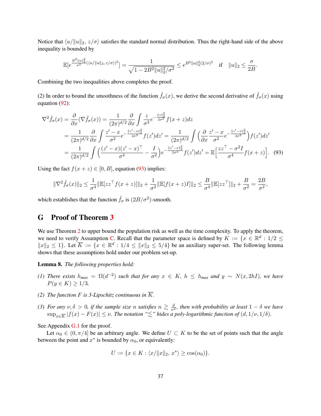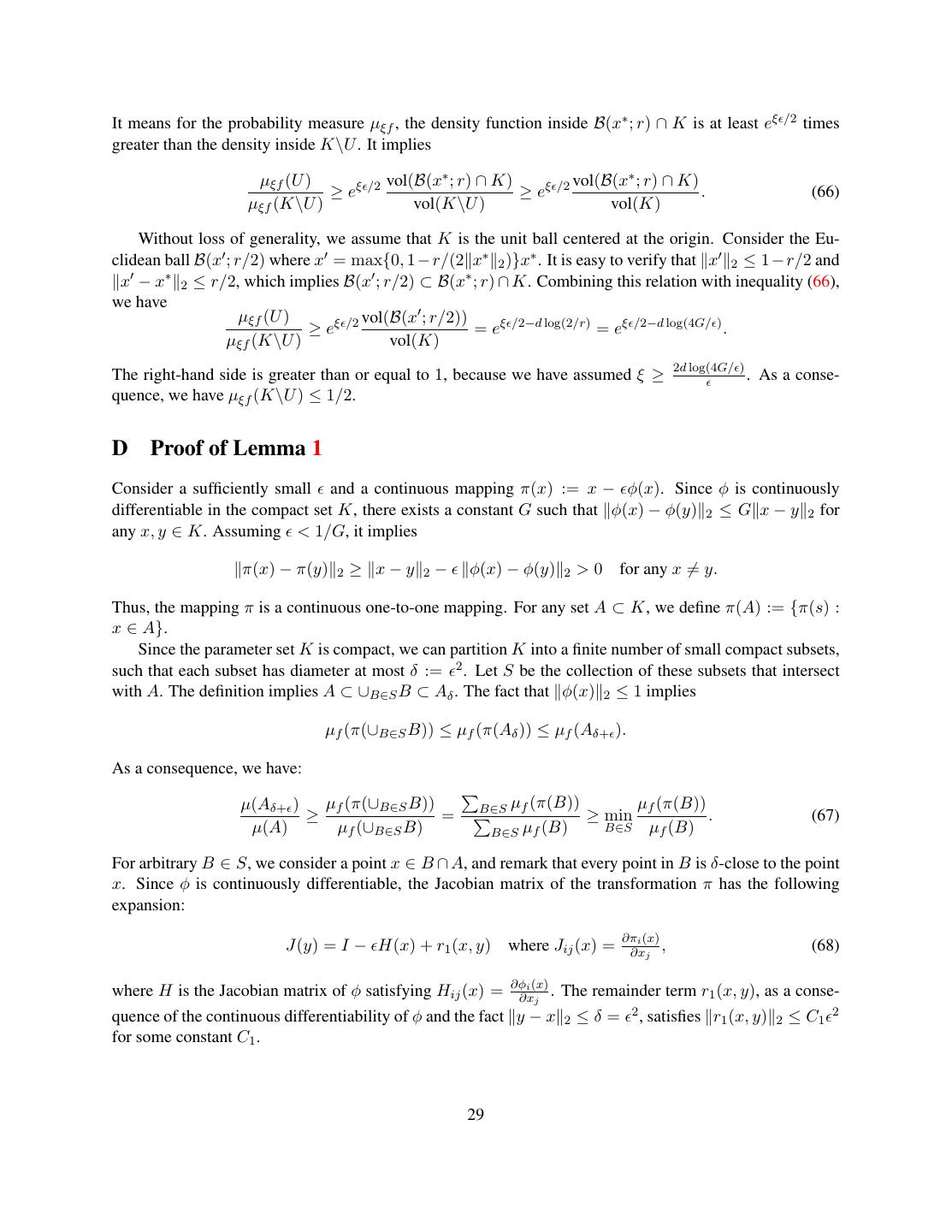 29 .It means for the probability measure µξf , the density function inside B(x∗ ; r) ∩ K is at least eξ /2 times greater than the density inside K\U . It implies µξf (U ) vol(B(x∗ ; r) ∩ K) /2 vol(B(x ∗ ; r) ∩ K) ≥ eξ /2 ≥ eξ . (66) µξf (K\U ) vol(K\U ) vol(K) Without loss of generality, we assume that K is the unit ball centered at the origin. Consider the Eu- clidean ball B(x ; r/2) where x = max{0, 1 − r/(2 x∗ 2 )}x∗ . It is easy to verify that x 2 ≤ 1 − r/2 and x − x∗ 2 ≤ r/2, which implies B(x ; r/2) ⊂ B(x∗ ; r) ∩ K. Combining this relation with inequality (66), we have µξf (U ) vol(B(x ; r/2)) ≥ eξ /2 = eξ /2−d log(2/r) = eξ /2−d log(4G/ ) . µξf (K\U ) vol(K) 2d log(4G/ ) The right-hand side is greater than or equal to 1, because we have assumed ξ ≥ . As a conse- quence, we have µξf (K\U ) ≤ 1/2. D Proof of Lemma 1 Consider a sufficiently small and a continuous mapping π(x) := x − φ(x). Since φ is continuously differentiable in the compact set K, there exists a constant G such that φ(x) − φ(y) 2 ≤ G x − y 2 for any x, y ∈ K. Assuming < 1/G, it implies π(x) − π(y) 2 ≥ x−y 2 − φ(x) − φ(y) 2 >0 for any x = y. Thus, the mapping π is a continuous one-to-one mapping. For any set A ⊂ K, we define π(A) := {π(s) : x ∈ A}. Since the parameter set K is compact, we can partition K into a finite number of small compact subsets, such that each subset has diameter at most δ := 2 . Let S be the collection of these subsets that intersect with A. The definition implies A ⊂ ∪B∈S B ⊂ Aδ . The fact that φ(x) 2 ≤ 1 implies µf (π(∪B∈S B)) ≤ µf (π(Aδ )) ≤ µf (Aδ+ ). As a consequence, we have: µ(Aδ+ ) µf (π(∪B∈S B)) B∈S µf (π(B)) µf (π(B)) ≥ = ≥ min . (67) µ(A) µf (∪B∈S B) µ B∈S f (B) B∈S µf (B) For arbitrary B ∈ S, we consider a point x ∈ B ∩ A, and remark that every point in B is δ-close to the point x. Since φ is continuously differentiable, the Jacobian matrix of the transformation π has the following expansion: ∂πi (x) J(y) = I − H(x) + r1 (x, y) where Jij (x) = ∂xj , (68) where H is the Jacobian matrix of φ satisfying Hij (x) = ∂φ∂xi (x) j . The remainder term r1 (x, y), as a conse- quence of the continuous differentiability of φ and the fact y − x 2 ≤ δ = 2 , satisfies r1 (x, y) 2 ≤ C1 2 for some constant C1 . 29
