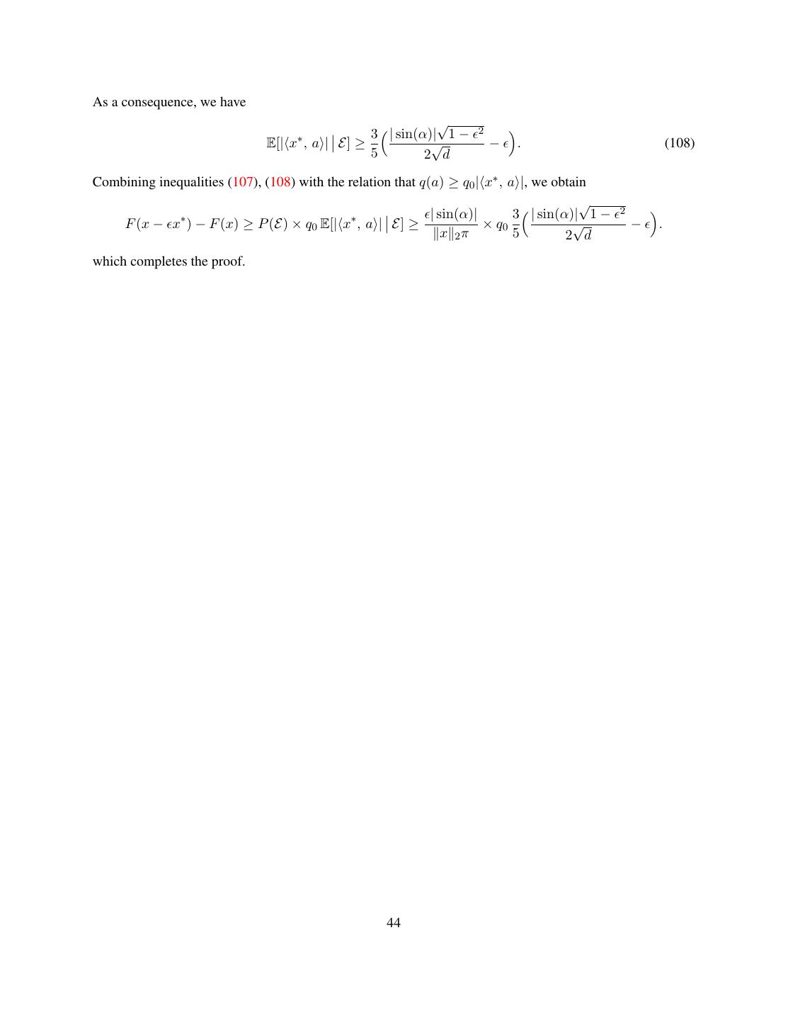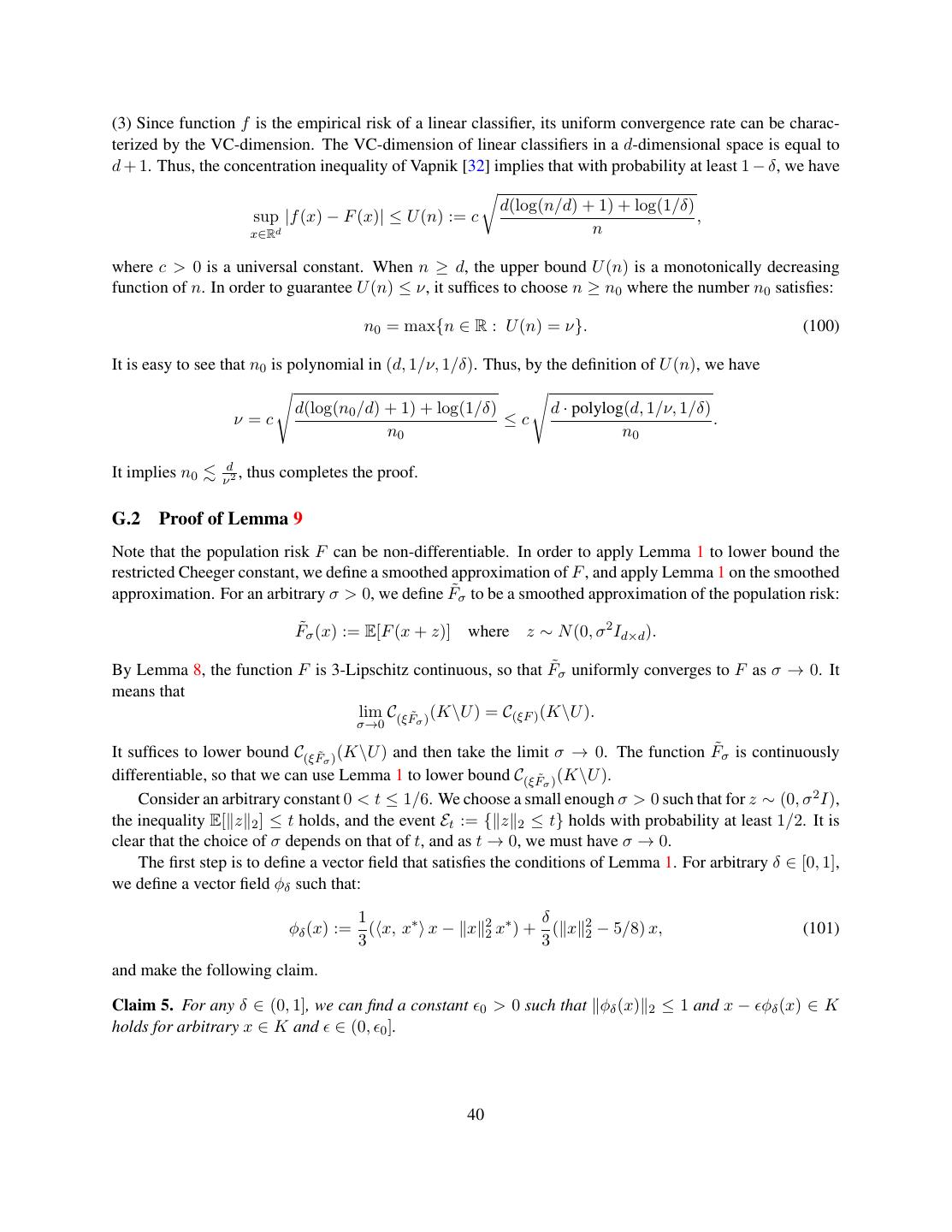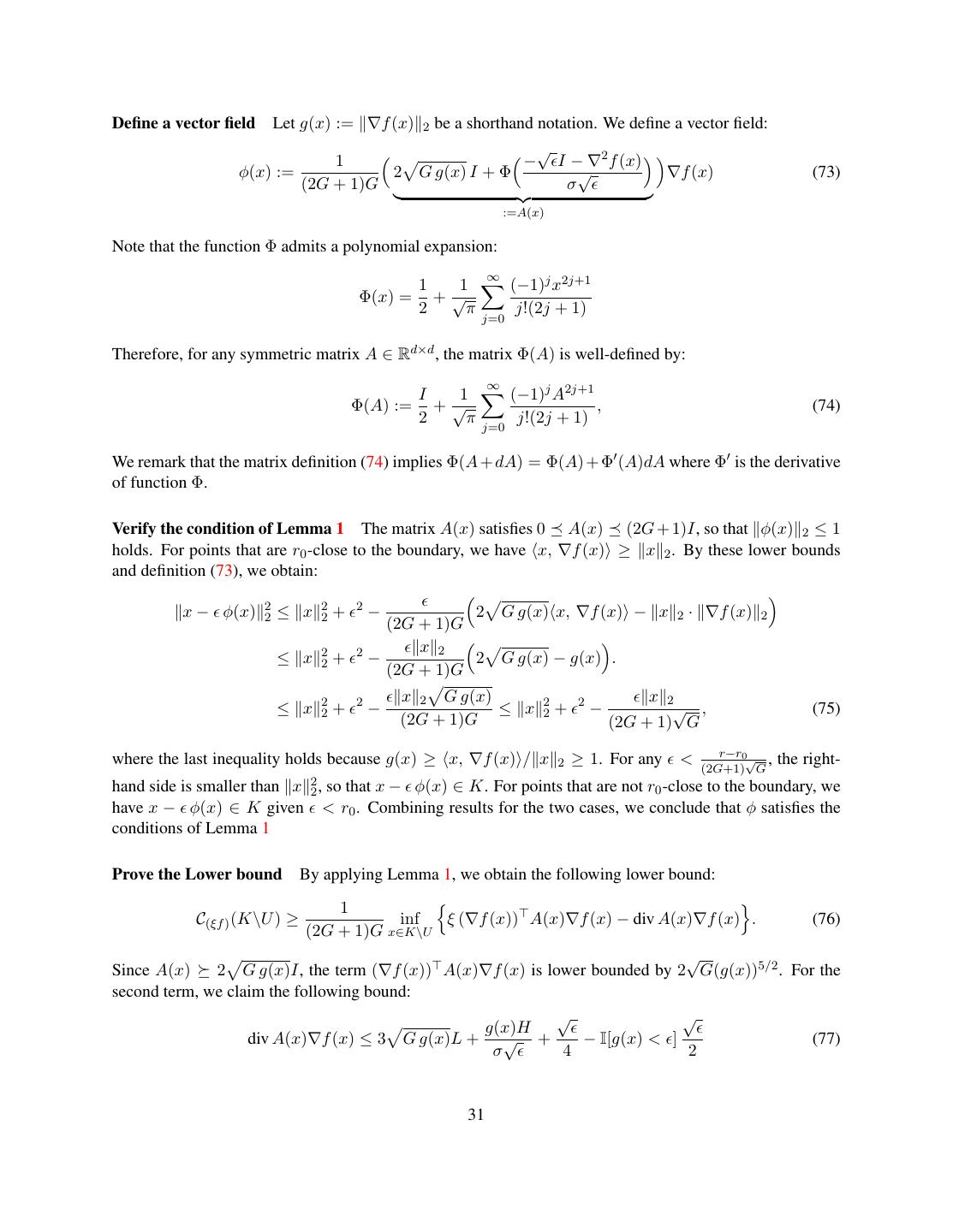 8 . Before demonstrating the applications of Lemma 1, we make several additional mild assumptions on the parameter space and on the function f . Assumption B (boundary condition and smoothness). • The parameter space K is a d-dimensional ball of radius r > 0 centered at the origin. There exists r0 > 0 such that for every point x satisfying x 2 ∈ [r − r0 , r], we have x, ∇f (x) ≥ x 2 . • For some G, L, H > 0, the function f is third-order differentiable with ∇f (x) 2 ≤ G, ∇2 f (x) ∗ ≤ L and ∇2 f (x) − ∇2 f (y) ∗ ≤ H x − y 2 for any x, y ∈ K. The first assumption requires the parameter space to be an Euclidean ball and imposes a gradient condi- tion on its boundary. This is made mainly for the convenience of theoretical analysis. We remark that for any function f , the condition on the boundary can be satisfied by adding a smooth barrier function ρ( x 2 ) to it, where the function ρ(t) = 0 for any t < r − 2r0 , but sharply increases on the interval [r − r0 , r] to produce large enough gradients. The second assumption requires the function f to be third-order differentiable. We shall relax the second assumption in Section 3. The following proposition describes a lower bound on C(ξf ) (K\U ) when f is a smooth function and the set U consists of approximate stationary points. Although we shall prove a stronger result, the proof of this proposition is a good example for demonstrating the power of Lemma 1. Proposition 2. Assume that Assumption B holds. For any > 0, define the set of -approximate stationary 2 points U := {x ∈ K : ∇f (x) 2 < }. For any ξ ≥ 2L/ 2 , we have C(ξf ) (K\U ) ≥ ξ2G . Proof. Recall that G is the Lipschitz constant of function f . Let the vector field be defined by φ(x) := 1 G ∇f (x), then we have φ(x) 2 ≤ 1. By Assumption B, it is easy to verify that the conditions of Lemma 1 hold. For any x ∈ K\U , the fact that ∇f (x) 2 ≥ implies: ξ ξ 2 φ(x), ξ∇f (x) = ∇f (x) 22 ≥ . G G Recall that L is the smoothness parameter. By Assumption B, the divergence of φ(x) is upper bounded by div φ(x) = G1 tr(∇2 f (x)) ≤ G1 ∇2 f (x) ∗ ≤ G L . Consequently, if we choose ξ ≥ 2L/ 2 as assumed, then we have: ξ 2 L ξ 2 φ(x), ξ∇f (x) − div φ(x) ≥ − ≥ . G G 2G Lemma 1 then establishes the claimed lower bound. Next, we consider approximate local minima [25, 1], which rules out local maxima and strict saddle points. For an arbitrary > 0, the set of -approximate local minima is defined by: √ U := {x ∈ K : ∇f (x) 2 < and ∇2 f (x) − I}. (11) We note that an approximate local minimum is not necessarily close to any local minimum of f . However, if we assume in addition the the function satisfies the (robust) strict-saddle property [14, 20], then any point x ∈ U is guaranteed to be close to a local minimum. Based on definition (11), we prove a lower bound for the set of approximate local minima. Proposition 3. Assume that Assumption B holds. For any > 0, let U be the set of -approximate local minima. For any ξ satisfying max{1, G5/2 L5 , H 5/2 } ξ ≥ O(1) · 2 G1/2 , (12) √ we have C(ξf ) (K\U ) ≥ 8(2G+1)G . The notation O(1) hides a poly-logarithmic function of (L, 1/ ). 8