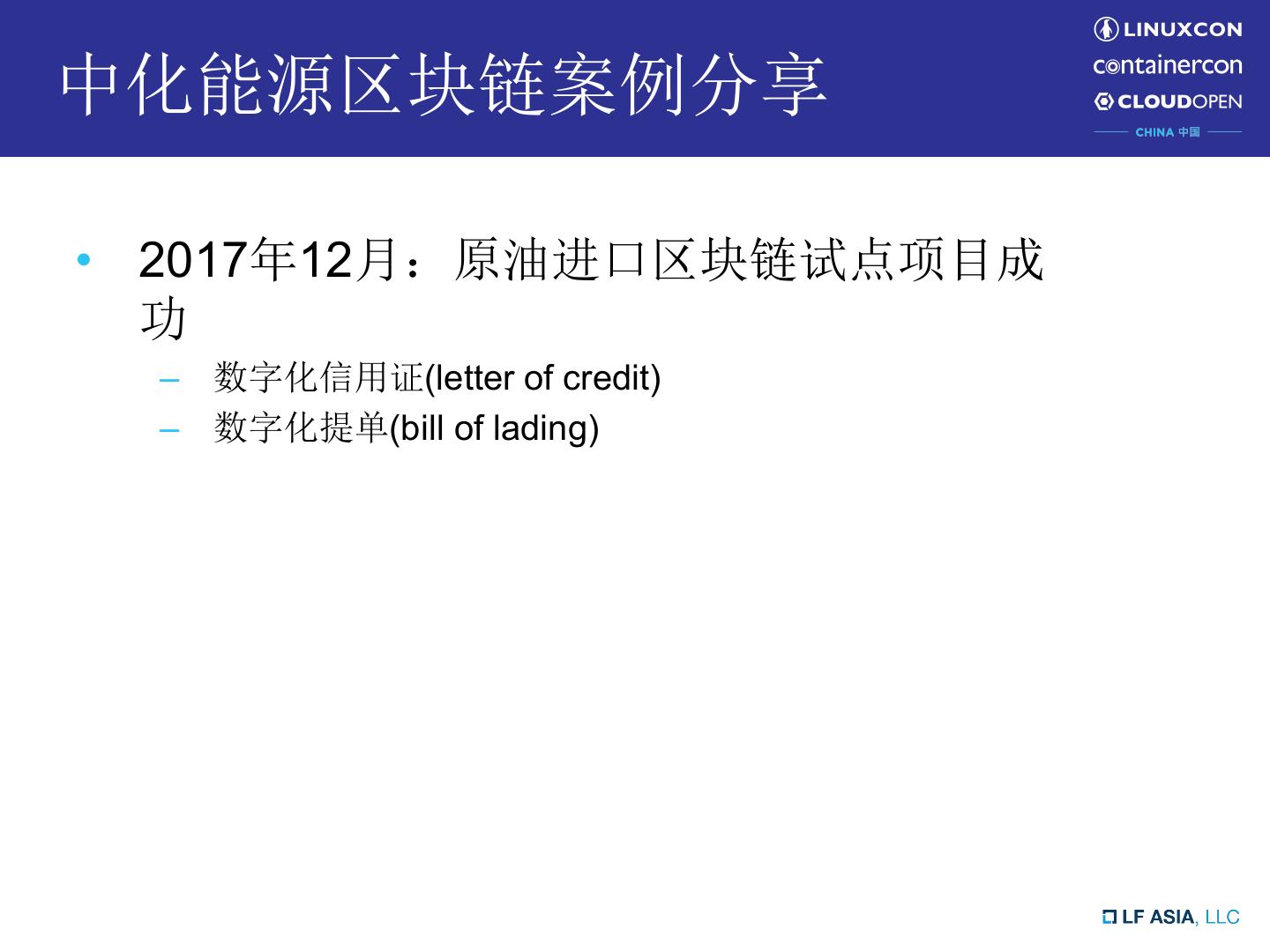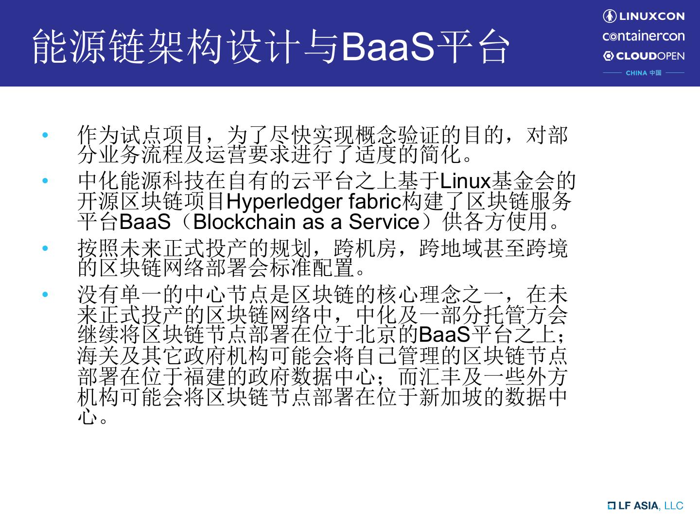10 .能源链架构设计与BaaS平台 • 作为试点项目,为了尽快实现概念验证的目的,对部 分业务流程及运营要求进行了适度的简化。 • 中化能源科技在自有的云平台之上基于Linux基金会的 开源区块链项目Hyperledger fabric构建了区块链服务 平台BaaS(Blockchain as a Service)供各方使用。 • 按照未来正式投产的规划,跨机房,跨地域甚至跨境 的区块链网络部署会标准配置。 • 没有单一的中心节点是区块链的核心理念之一,在未 来正式投产的区块链网络中,中化及一部分托管方会 继续将区块链节点部署在位于北京的BaaS平台之上; 海关及其它政府机构可能会将自己管理的区块链节点 部署在位于福建的政府数据中心;而汇丰及一些外方 机构可能会将区块链节点部署在位于新加坡的数据中 心。