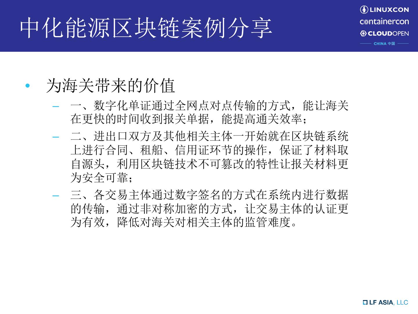 6 .中化能源区块链案例分享 • 为海关带来的价值 – 一、数字化单证通过全网点对点传输的方式,能让海关 在更快的时间收到报关单据,能提高通关效率; – 二、进出口双方及其他相关主体一开始就在区块链系统 上进行合同、租船、信用证环节的操作,保证了材料取 自源头,利用区块链技术不可篡改的特性让报关材料更 为安全可靠; – 三、各交易主体通过数字签名的方式在系统内进行数据 的传输,通过非对称加密的方式,让交易主体的认证更 为有效,降低对海关对相关主体的监管难度。
