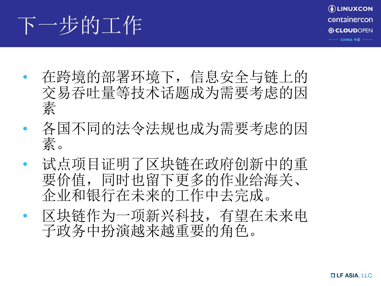 12 .下一步的工作 • 在跨境的部署环境下,信息安全与链上的 交易吞吐量等技术话题成为需要考虑的因 素 • 各国不同的法令法规也成为需要考虑的因 素。 • 试点项目证明了区块链在政府创新中的重 要价值,同时也留下更多的作业给海关、 企业和银行在未来的工作中去完成。 • 区块链作为一项新兴科技,有望在未来电 子政务中扮演越来越重要的角色。