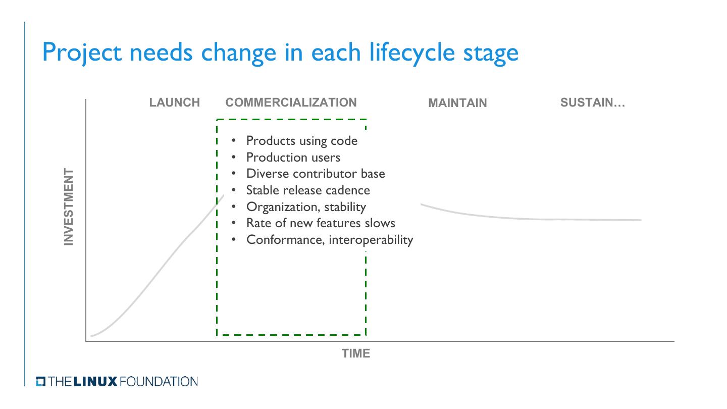 21 .Project needs change in each lifecycle stage LAUNCH COMMERCIALIZATION MAINTAIN SUSTAIN… • Established community • Established products INVESTMENT • Conformance program • Interdependency w/other projects • Long term support releases • Stable security policy • Bug tracking drives priorities TIME