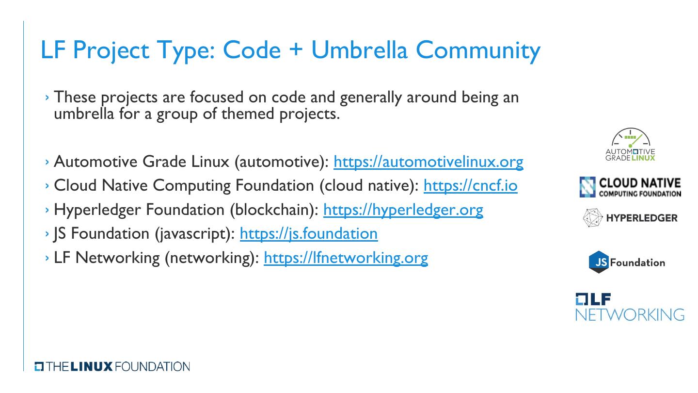 26 .LF Project Type: Code + Umbrella Community › These projects are focused on code and generally around being an umbrella for a group of themed projects. › Automotive Grade Linux (automotive): https://automotivelinux.org › Cloud Native Computing Foundation (cloud native): https://cncf.io › Hyperledger Foundation (blockchain): https://hyperledger.org › JS Foundation (javascript): https://js.foundation › LF Networking (networking): https://lfnetworking.org