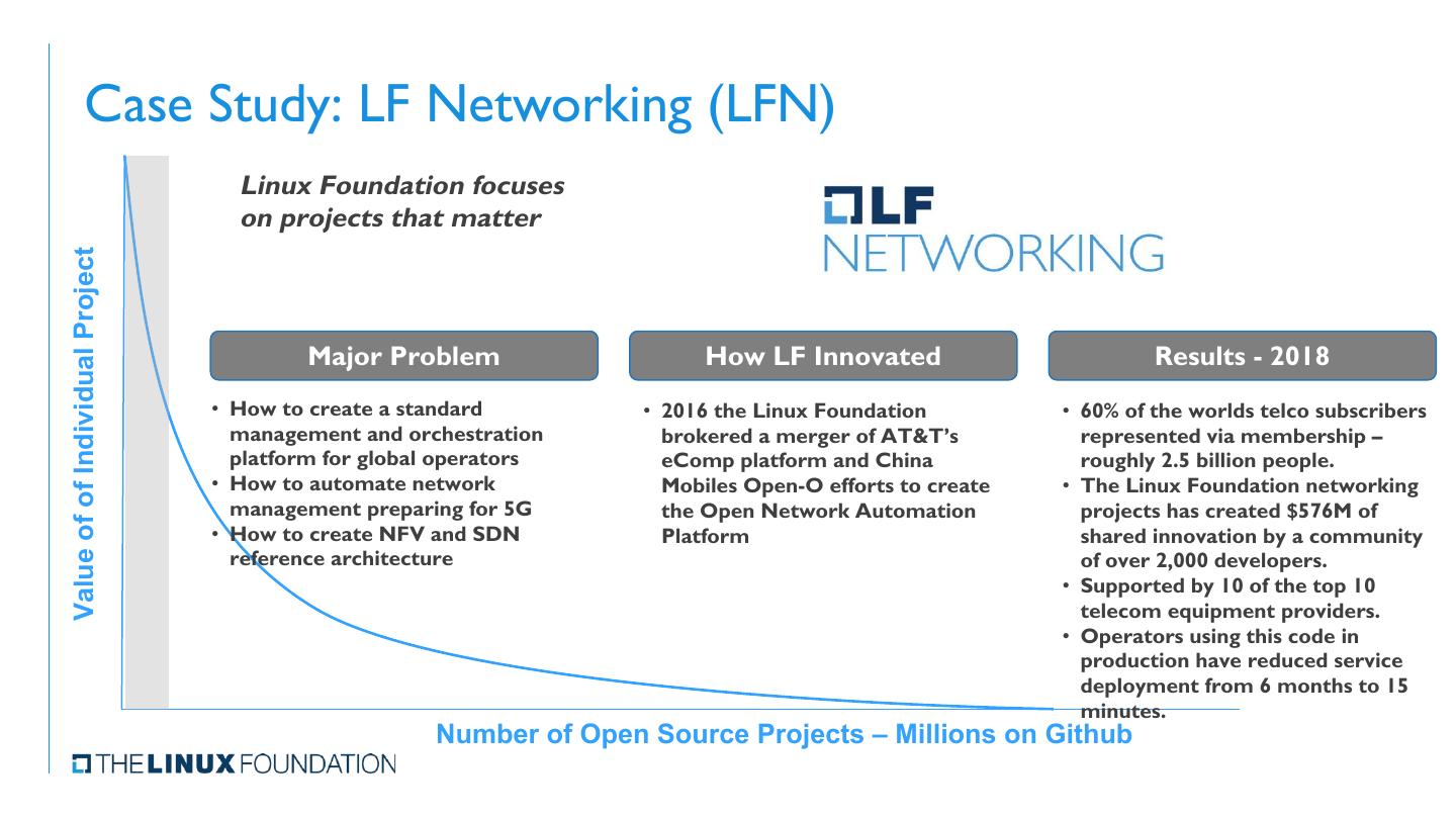 29 . Case Study: LF Networking (LFN) Linux Foundation focuses on projects that matter Value of of Individual Project Major Problem How LF Innovated Results - 2018 • How to create a standard • 2016 the Linux Foundation • 60% of the worlds telco subscribers management and orchestration brokered a merger of AT&T’s represented via membership – platform for global operators eComp platform and China roughly 2.5 billion people. • How to automate network Mobiles Open-O efforts to create • The Linux Foundation networking management preparing for 5G the Open Network Automation projects has created $576M of • How to create NFV and SDN Platform shared innovation by a community reference architecture of over 2,000 developers. • Supported by 10 of the top 10 telecom equipment providers. • Operators using this code in production have reduced service deployment from 6 months to 15 minutes. Number of Open Source Projects – Millions on Github
